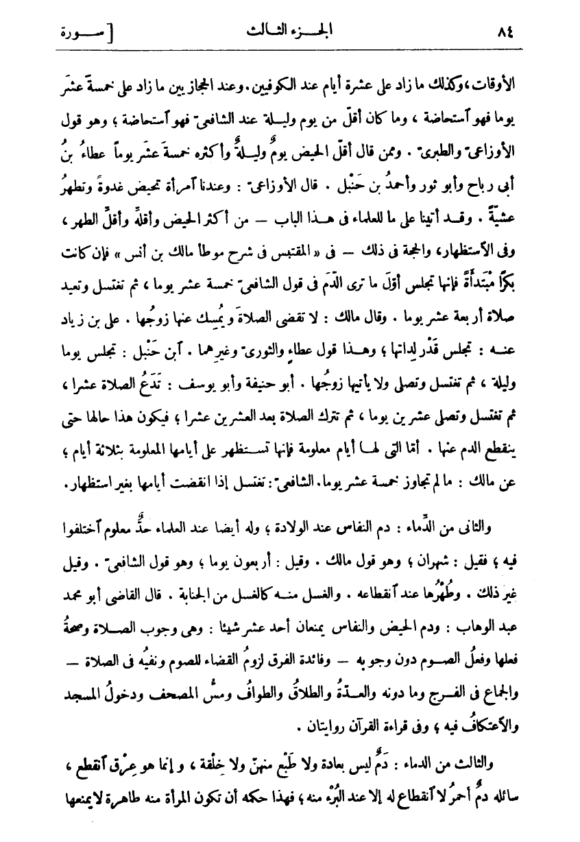 الْأَوْقَاتِ، وَكَذَلِكَ مَا زَادَ عَلَى عَشَرَةِ أَيَّامٍ عِنْدَ الْكُوفِيِّينَ. وَعِنْدَ الْحِجَازِيِّينَ مَا زَادَ عَلَى خَمْسَةَ عَشَرَ يَوْمًا فَهُوَ اسْتِحَاضَةٌ. وَمَا كَانَ أَقَلَّ مِنْ يَوْمٍ وَلَيْلَةٍ عِنْدَ الشَّافِعِيِّ فَهُوَ اسْتِحَاضَةٌ، وَهُوَ قَوْلُ الْأَوْزَاعِيِّ وَالطَّبَرِيِّ. وَمِمَّنْ قَالَ أَقَلُّ الْحَيْضِ يَوْمٌ وَلَيْلَةٌ وَأَكْثَرُهُ خَمْسَةَ عَشَرَ يَوْمًا عَطَاءُ بْنُ أَبِي رَبَاحٍ وَأَبُو ثَوْرٍ وَأَحْمَدُ بْنُ حَنْبَلٍ. قَالَ الْأَوْزَاعِيُّ: وَعِنْدَنَا امْرَأَةٌ تحيض غدوة وتطهر عشية. قد أَتَيْنَا عَلَى مَا لِلْعُلَمَاءِ فِي هَذَا الْبَابِ- مِنْ أَكْثَرِ الْحَيْضِ وَأَقَلِّهِ وَأَقَلِّ الطُّهْرِ، وَفَى الِاسْتِظْهَارِ، وَالْحُجَّةُ فِي ذَلِكَ- فِي" الْمُقْتَبَسِ فِي شَرْحِ مُوَطَّإِ مَالِكِ بْنِ أَنَسٍ" فَإِنْ كَانَتْ بِكْرًا مُبْتَدَأَةً فَإِنَّهَا تَجْلِسُ أَوَّلَ مَا تَرَى الدَّمَ فِي قَوْلِ الشَّافِعِيِّ خَمْسَةَ عَشَرَ يَوْمًا، ثُمَّ تَغْتَسِلُ وَتُعِيدُ صَلَاةَ أَرْبَعَةَ عَشَرَ يَوْمًا. وَقَالَ مَالِكٌ: لَا تَقْضِي الصَّلَاةَ وَيُمْسِكُ عَنْهَا زَوْجُهَا. عَلِيُّ بْنُ زِيَادٍ عَنْهُ: تَجْلِسُ قَدْرَ لِدَاتِهَا، وَهَذَا قَوْلُ عَطَاءٍ وَالثَّوْرِيِّ وَغَيْرِهِمَا. ابْنُ حَنْبَلٍ: تَجْلِسُ يَوْمًا وَلَيْلَةً، ثُمَّ تَغْتَسِلُ وَتُصَلِّي وَلَا يَأْتِيهَا زَوْجُهَا. أَبُو حَنِيفَةَ وَأَبُو يُوسُفَ: تَدَعُ الصَّلَاةَ عَشْرًا، ثُمَّ تَغْتَسِلُ وَتُصَلِّي عِشْرِينَ يَوْمًا، ثُمَّ تَتْرُكُ الصَّلَاةَ بَعْدَ الْعِشْرِينَ عَشْرًا، فَيَكُونُ هَذَا حَالَهَا حَتَّى يَنْقَطِعَ الدَّمُ عَنْهَا. أَمَّا الَّتِي لَهَا أَيَّامٌ مَعْلُومَةٌ فَإِنَّهَا تَسْتَظْهِرُ عَلَى أَيَّامِهَا الْمَعْلُومَةِ بِثَلَاثَةِ أَيَّامٍ، عَنْ مَالِكٍ: مَا لَمْ تُجَاوِزْ خَمْسَةَ عَشَرَ يَوْمًا. الشَّافِعِيُّ: تَغْتَسِلُ إِذَا انْقَضَتْ أَيَّامُهَا بِغَيْرِ اسْتِظْهَارٍ. وَالثَّانِي مِنَ الدِّمَاءِ: دَمُ النِّفَاسِ عِنْدَ الْوِلَادَةِ، وَلَهُ أَيْضًا عِنْدَ الْعُلَمَاءِ حَدٌّ مَعْلُومٌ اخْتَلَفُوا فِيهِ، فَقِيلَ: شَهْرَانِ، وَهُوَ قَوْلُ مَالِكٍ. وَقِيلَ: أَرْبَعُونَ يَوْمًا، وَهُوَ قَوْلُ الشَّافِعِيِّ. وَقِيلَ غَيْرُ ذَلِكَ. وَطُهْرُهَا عِنْدَ انْقِطَاعِهِ. وَالْغُسْلُ مِنْهُ كَالْغُسْلِ مِنَ الْجَنَابَةِ. قَالَ الْقَاضِي أَبُو مُحَمَّدٍ عَبْدُ الْوَهَّابِ: وَدَمُ الْحَيْضِ وَالنِّفَاسِ يَمْنَعَانِ أَحَدَ عَشَرَ شَيْئًا: وَهِيَ وُجُوبُ الصَّلَاةِ وَصِحَّةُ فِعْلِهَا وَفِعْلُ الصَّوْمِ دُونَ وُجُوبِهِ- وَفَائِدَةُ الْفَرْقِ لُزُومُ الْقَضَاءِ لِلصَّوْمِ وَنَفْيُهُ فِي الصَّلَاةِ- وَالْجِمَاعُ فِي الْفَرْجِ وَمَا دُونَهُ وَالْعِدَّةُ وَالطَّلَاقُ وَالطَّوَافُ وَمَسُّ الْمُصْحَفِ وَدُخُولُ الْمَسْجِدِ وَالِاعْتِكَافُ فِيهِ، وَفِي قِرَاءَةِ الْقُرْآنِ رِوَايَتَانِ. وَالثَّالِثُ مِنَ الدِّمَاءِ: دَمٌ لَيْسَ بِعَادَةٍ وَلَا طَبْعٍ مِنْهُنَّ وَلَا خِلْقَةٍ، وَإِنَّمَا هُوَ عِرْقٌ انْقَطَعَ، سَائِلُهُ دَمٌ أَحْمَرُ لَا انْقِطَاعَ لَهُ إِلَّا عِنْدَ الْبُرْءِ مِنْهُ، فَهَذَا حُكْمُهُ أَنْ تَكُونَ الْمَرْأَةُ مِنْهُ طَاهِرَةً لَا يَمْنَعُهَا