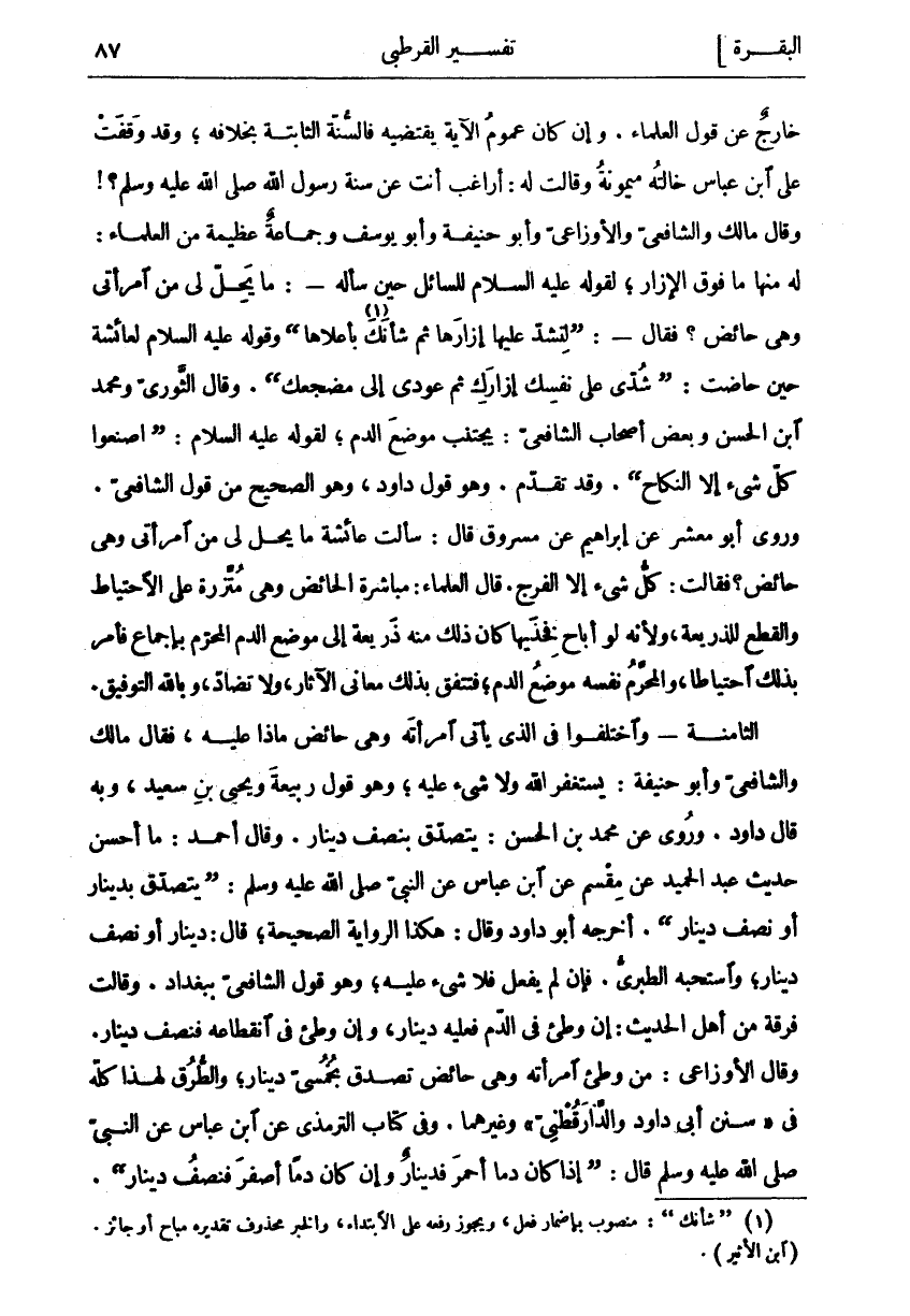 خَارِجٌ عَنْ قَوْلِ الْعُلَمَاءِ. وَإِنْ كَانَ عُمُومُ الْآيَةِ يَقْتَضِيهِ فَالسُّنَّةُ الثَّابِتَةُ بِخِلَافِهِ، وَقَدْ وَقَفَتْ عَلَى ابْنِ عَبَّاسٍ خَالَتُهُ مَيْمُونَةُ وَقَالَتْ لَهُ: أَرَاغِبٌ أَنْتَ عَنْ سُنَّةِ رَسُولِ اللَّهِ صَلَّى اللَّهُ عَلَيْهِ وَسَلَّمَ؟! وَقَالَ مَالِكٌ وَالشَّافِعِيُّ وَالْأَوْزَاعِيُّ وَأَبُو حَنِيفَةَ وَأَبُو يُوسُفَ وَجَمَاعَةٌ عَظِيمَةٌ مِنَ الْعُلَمَاءِ: لَهُ مِنْهَا مَا فَوْقَ الْإِزَارِ، لِقَوْلِهِ عَلَيْهِ السَّلَامُ لِلسَّائِلِ حِينَ سَأَلَهُ-: مَا يَحِلُّ لِي مِنَ امْرَأَتِي وَهِيَ حَائِضٌ؟ فَقَالَ-:" لِتَشُدَّ عَلَيْهَا إِزَارَهَا ثُمَّ شَأْنُكَ «١» بِأَعْلَاهَا" وَقَوْلُهُ عَلَيْهِ السَّلَامُ لِعَائِشَةَ حِينَ حَاضَتْ:" شُدِّي عَلَى نَفْسِكِ إِزَارَكِ ثُمَّ عُودِي إِلَى مَضْجَعِكِ". وَقَالَ الثَّوْرِيُّ ومحمد ابن الحسن وبعض أصحاب الشافعي: مجتنب مَوْضِعَ الدَّمِ، لِقَوْلِهِ عَلَيْهِ السَّلَامُ:" اصْنَعُوا كُلَّ شي إِلَّا النِّكَاحَ". وَقَدْ تَقَدَّمَ. وَهُوَ قَوْلُ دَاوُدَ، وَهُوَ الصَّحِيحُ مِنْ قَوْلِ الشَّافِعِيِّ. وَرَوَى أَبُو مَعْشَرٍ عَنْ إِبْرَاهِيمَ عَنْ مَسْرُوقٍ قَالَ: سَأَلْتُ عَائِشَةَ مَا يَحِلُّ لِي مِنَ امْرَأَتِي وَهِيَ حائض؟ فقالت: كل شي إِلَّا الْفَرْجَ. قَالَ الْعُلَمَاءُ: مُبَاشَرَةُ الْحَائِضِ وَهِيَ مُتَّزِرَةٌ عَلَى الِاحْتِيَاطِ وَالْقَطْعِ لِلذَّرِيعَةِ، وَلِأَنَّهُ لَوْ أَبَاحَ فَخِذَيْهَا كَانَ ذَلِكَ مِنْ ذَرِيعَةٍ إِلَى مَوْضِعِ الدَّمِ الْمُحَرَّمِ بِإِجْمَاعٍ فَأَمَرَ بِذَلِكَ احْتِيَاطًا، وَالْمُحَرَّمُ نَفْسُهُ مَوْضِعُ الدَّمِ، فَتَتَّفِقُ بِذَلِكَ مَعَانِي الْآثَارِ، وَلَا تَضَادَّ، وَبِاللَّهِ التَّوْفِيقُ. الثَّامِنَةُ- وَاخْتَلَفُوا فِي الَّذِي يَأْتِي امْرَأَتَهُ وَهِيَ حَائِضٌ مَاذَا عَلَيْهِ، فَقَالَ مَالِكٌ وَالشَّافِعِيُّ وَأَبُو حَنِيفَةَ: يَسْتَغْفِرُ الله ولا شي عَلَيْهِ، وَهُوَ قَوْلُ رَبِيعَةَ وَيَحْيَى بْنِ سَعِيدٍ، وَبِهِ قَالَ دَاوُدُ. وَرُوِيَ عَنْ مُحَمَّدِ بْنِ الْحَسَنِ: يَتَصَدَّقُ بِنِصْفِ دِينَارٍ. وَقَالَ أَحْمَدُ: مَا أَحْسَنَ حَدِيثَ عَبْدِ الْحَمِيدِ عَنْ مِقْسَمٍ عَنِ ابْنِ عَبَّاسٍ عَنِ النَّبِيِّ صَلَّى اللَّهُ عَلَيْهِ وَسَلَّمَ:" يَتَصَدَّقُ بِدِينَارٍ أَوْ نِصْفِ دِينَارٍ". أَخْرَجَهُ أَبُو دَاوُدَ وَقَالَ: هَكَذَا الرِّوَايَةُ الصَّحِيحَةُ، قَالَ: دِينَارٌ أَوْ نِصْفُ دِينَارٍ، وَاسْتَحَبَّهُ الطَّبَرِيُّ. فَإِنْ لم يفعل فلا شي عَلَيْهِ، وَهُوَ قَوْلُ الشَّافِعِيِّ بِبَغْدَادَ. وَقَالَتْ فِرْقَةٌ مِنْ أَهْلِ الْحَدِيثِ: إِنْ وَطِئَ فِي الدَّمِ فَعَلَيْهِ دِينَارٌ، وَإِنْ وَطِئَ فِي انْقِطَاعِهِ فَنِصْفُ دِينَارٍ. وَقَالَ الْأَوْزَاعِيُّ: مَنْ وَطِئَ امْرَأَتَهُ وَهِيَ حَائِضٌ تَصَدَّقَ بِخُمُسَيِّ دِينَارٍ، وَالطُّرُقُ لِهَذَا كُلِّهِ فِي" سُنَنِ أَبِي دَاوُدَ وَالدَّارَقُطْنِيِّ" وَغَيْرِهِمَا. وَفِي كِتَابِ التِّرْمِذِيِّ عَنِ ابْنِ عَبَّاسٍ عَنِ النَّبِيِّ صَلَّى اللَّهُ عَلَيْهِ وَسَلَّمَ قَالَ:" إِذَا كَانَ دَمًا أَحْمَرَ فَدِينَارٌ وَإِنْ كَانَ دَمًا أَصْفَرَ فنصف دينار".