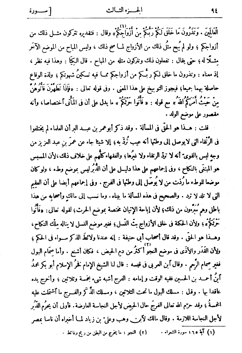 «١» ". وَقَالَ: فَتَقْدِيرُهُ تَتْرُكُونَ مِثْلَ ذَلِكَ مِنْ أَزْوَاجِكُمْ، وَلَوْ لَمْ يُبَحْ مِثْلُ ذَلِكَ مِنَ الْأَزْوَاجِ لَمَا صَحَّ ذَلِكَ، وَلَيْسَ الْمُبَاحُ مِنَ الْمَوْضِعِ الْآخَرِ مِثْلًا لَهُ، حَتَّى يُقَالَ: تَفْعَلُونَ ذَلِكَ وَتَتْرُكُونَ مِثْلَهُ مِنَ الْمُبَاحِ. قَالَ الْكِيَا: وَهَذَا فِيهِ نَظَرٌ، إِذْ مَعْنَاهُ: وَتَذَرُونَ مَا خَلَقَ لَكُمْ رَبُّكُمْ مِنْ أَزْوَاجِكُمْ مِمَّا فِيهِ تَسْكِينُ شَهْوَتِكُمُ، وَلَذَّةُ الْوَقَاعِ حَاصِلَةٌ بِهِمَا جَمِيعًا، فَيَجُوزُ التَّوْبِيخُ عَلَى هَذَا الْمَعْنَى. وَفِي قَوْلِهِ تَعَالَى:" فَإِذا تَطَهَّرْنَ فَأْتُوهُنَّ مِنْ حَيْثُ أَمَرَكُمُ اللَّهُ" مَعَ قَوْلِهِ:" فَأْتُوا حَرْثَكُمْ" مَا يَدُلُّ عَلَى أَنَّ فِي الْمَأْتَى اخْتِصَاصًا، وَأَنَّهُ مَقْصُورٌ عَلَى مَوْضِعِ الْوَلَدِ. قُلْتُ: هَذَا هُوَ الْحَقُّ فِي الْمَسْأَلَةِ. وَقَدْ ذَكَرَ أَبُو عُمَرَ بْنُ عَبْدِ الْبَرِّ أَنَّ الْعُلَمَاءَ لَمْ يَخْتَلِفُوا فِي الرَّتْقَاءِ الَّتِي لَا يُوصَلُ إِلَى وَطْئِهَا أَنَّهُ عَيْبٌ تُرَدُّ بِهِ، إِلَّا شَيْئًا جَاءَ عَنْ عُمَرَ بْنِ عَبْدِ الْعَزِيزِ مِنْ وَجْهٍ لَيْسَ بِالْقَوِيِّ أَنَّهُ لَا تُرَدُّ الرَّتْقَاءُ وَلَا غَيْرُهَا، وَالْفُقَهَاءُ كُلُّهُمْ عَلَى خِلَافِ ذَلِكَ، لِأَنَّ الْمَسِيسَ هُوَ الْمُبْتَغَى بِالنِّكَاحِ، وَفِي إِجْمَاعِهِمْ عَلَى هَذَا دليل على أن الدبر ليس بموضع وطئ، ولو كان موضعا للوطي مَا رُدَّتْ مَنْ لَا يُوصَلُ إِلَى وَطْئِهَا فِي الْفَرْجِ. وَفِي إِجْمَاعِهِمْ أَيْضًا عَلَى أَنَّ الْعَقِيمَ الَّتِي لَا تَلِدُ لَا تُرَدُّ. وَالصَّحِيحُ فِي هَذِهِ الْمَسْأَلَةِ مَا بَيَّنَّاهُ. وَمَا نُسِبَ إِلَى مَالِكٍ وَأَصْحَابِهِ مِنْ هَذَا بَاطِلٌ وَهُمْ مُبَرَّءُونَ مِنْ ذَلِكَ، لِأَنَّ إِبَاحَةَ الْإِتْيَانِ مُخْتَصَّةٌ بِمَوْضِعِ الْحَرْثِ، لِقَوْلِهِ تَعَالَى:" فَأْتُوا حَرْثَكُمْ"، وَلِأَنَّ الْحِكْمَةَ فِي خَلْقِ الْأَزْوَاجِ بَثُّ النَّسْلِ، فَغَيْرُ موضع النسل لا يناله مالك النِّكَاحِ، وَهَذَا هُوَ الْحَقُّ. وَقَدْ قَالَ أَصْحَابُ أَبِي حَنِيفَةَ: إِنَّهُ عِنْدَنَا وَلَائِطُ الذَّكَرِ سَوَاءٌ فِي الْحُكْمِ، وَلِأَنَّ الْقَذَرَ وَالْأَذَى فِي مَوْضِعِ النَّجْوِ «٢» أَكْثَرُ مِنْ دَمِ الْحَيْضِ، فَكَانَ أَشْنَعَ. وَأَمَّا صِمَامُ الْبَوْلِ فَغَيْرُ صِمَامِ الرَّحِمِ. وَقَالَ ابْنُ الْعَرَبِيِّ فِي قَبَسِهِ: قَالَ لَنَا الشَّيْخُ الْإِمَامُ فَخْرُ الْإِسْلَامِ أَبُو بَكْرٍ مُحَمَّدُ بْنُ أَحْمَدَ بْنِ الْحُسَيْنِ فَقِيهُ الْوَقْتِ وَإِمَامُهُ: الْفَرْجُ أشبه شي بِخَمْسَةٍ وَثَلَاثِينَ، وَأَخْرَجَ يَدَهُ عَاقِدًا بِهَا. وَقَالَ: مَسْلَكُ الْبَوْلِ مَا تَحْتَ الثَّلَاثِينَ، وَمَسْلَكُ الذَّكَرِ وَالْفَرْجِ مَا اشْتَمَلَتْ عَلَيْهِ الْخَمْسَةُ، وَقَدْ حَرَّمَ اللَّهُ تَعَالَى الْفَرْجَ حَالَ الْحَيْضِ لِأَجْلِ النَّجَاسَةِ الْعَارِضَةِ. فَأَوْلَى أَنْ يُحَرَّمَ الدُّبُرُ لِأَجْلِ النَّجَاسَةِ اللَّازِمَةِ. وَقَالَ مَالِكٌ لِابْنِ وَهْبٍ وَعَلِيِّ بْنِ زياد لما أخبراه أن ناسا بمصر