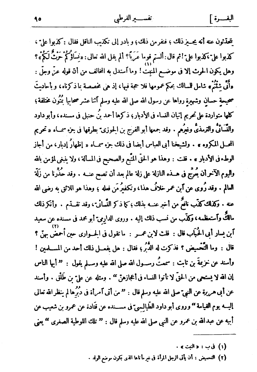يَتَحَدَّثُونَ عَنْهُ أَنَّهُ يُجِيزُ ذَلِكَ، فَنَفَّرَ مِنْ ذَلِكَ، وَبَادَرَ إِلَى تَكْذِيبِ النَّاقِلِ فَقَالَ: كَذَبُوا عَلَيَّ، كَذَبُوا عَلَيَّ، كَذَبُوا عَلَيَّ! ثُمَّ قَالَ: أَلَسْتُمْ قَوْمًا عَرَبًا؟ أَلَمْ يَقُلِ اللَّهُ تَعَالَى:" نِساؤُكُمْ حَرْثٌ لَكُمْ"؟ وَهَلْ يَكُونُ الْحَرْثُ إِلَّا فِي مَوْضِعِ الْمَنْبَتِ «١»! وَمَا اسْتَدَلَّ بِهِ الْمُخَالِفُ مِنْ أَنَّ قَوْلَهُ عَزَّ وَجَلَّ:" أَنَّى شِئْتُمْ" شَامِلٌ لِلْمَسَالِكِ بِحُكْمِ عُمُومِهَا فَلَا حُجَّةَ فِيهَا، إِذْ هِيَ مُخَصَّصَةٌ بِمَا ذَكَرْنَاهُ، وَبِأَحَادِيثَ صَحِيحَةٍ حِسَانٍ وَشَهِيرَةٍ رَوَاهَا عَنْ رَسُولِ اللَّهِ صَلَّى اللَّهُ عَلَيْهِ وَسَلَّمَ اثْنَا عَشَرَ صَحَابِيًّا بِمُتُونٍ مُخْتَلِفَةٍ، كُلُّهَا مُتَوَارِدَةٌ عَلَى تَحْرِيمِ إِتْيَانِ النِّسَاءِ فِي الْأَدْبَارِ، ذَكَرَهَا أَحْمَدُ بْنُ حَنْبَلٍ فِي مُسْنَدِهِ، وَأَبُو دَاوُدَ وَالنَّسَائِيُّ وَالتِّرْمِذِيُّ وَغَيْرُهُمْ وَقَدْ جَمَعَهَا أَبُو الْفَرَجِ بْنُ الْجَوْزِيِّ بِطُرُقِهَا فِي جُزْءٍ سَمَّاهُ" تَحْرِيمُ الْمَحَلِّ الْمَكْرُوهِ". وَلِشَيْخِنَا أَبِي الْعَبَّاسِ أَيْضًا فِي ذَلِكَ جُزْءٌ سَمَّاهُ" إِظْهَارُ إدبار، من أجاز الوطي فِي الْأَدْبَارِ". قُلْتُ: وَهَذَا هُوَ الْحَقُّ الْمُتَّبَعُ وَالصَّحِيحُ فِي الْمَسْأَلَةِ، وَلَا يَنْبَغِي لِمُؤْمِنٍ بِاللَّهِ وَالْيَوْمِ الْآخِرِ أَنْ يُعَرِّجَ فِي هَذِهِ النَّازِلَةِ عَلَى زَلَّةِ عَالِمٍ بَعْدَ أَنْ تَصِحَّ عَنْهُ. وَقَدْ حَذَّرْنَا مِنْ زَلَّةِ الْعَالِمِ. وَقَدْ رُوِيَ عَنِ ابْنِ عُمَرَ خِلَافَ هَذَا، وَتَكْفِيرُ مَنْ فَعَلَهُ، وَهَذَا هُوَ اللَّائِقُ بِهِ رَضِيَ اللَّهُ عَنْهُ. وَكَذَلِكَ كَذَّبَ نَافِعٌ مَنْ أَخْبَرَ عَنْهُ بِذَلِكَ، كَمَا ذَكَرَ النَّسَائِيُّ، وَقَدْ تَقَدَّمَ. وَأَنْكَرَ ذَلِكَ مَالِكٌ وَاسْتَعْظَمَهُ، وَكَذَّبَ مَنْ نَسَبَ ذَلِكَ إِلَيْهِ. وَرَوَى الدَّارِمِيُّ أَبُو مُحَمَّدٍ فِي مُسْنَدِهِ عَنْ سعيد ابن يَسَارٍ أَبِي الْحُبَابِ قَالَ: قُلْتُ لِابْنِ عُمَرَ: مَا تَقُولُ فِي الْجَوَارِي حِينَ أُحَمِّضُ «٢» بِهِنَّ؟ قَالَ: وَمَا التَّحْمِيضُ؟ فَذَكَرْتُ لَهُ الدُّبُرَ، فَقَالَ: هَلْ يَفْعَلُ ذَلِكَ أَحَدٌ مِنَ الْمُسْلِمِينَ! وَأُسْنِدَ عَنْ خُزَيْمَةَ بْنِ ثَابِتٍ: سَمِعْتُ رَسُولَ اللَّهِ صَلَّى اللَّهُ عَلَيْهِ وَسَلَّمَ يَقُولُ:" أَيُّهَا النَّاسُ إن الله لا يَسْتَحْيِي مِنَ الْحَقِّ لَا تَأْتُوا النِّسَاءَ فِي أَعْجَازِهِنَّ". وَمِثْلُهُ عَنْ عَلِيِّ بْنِ طَلْقٍ. وَأُسْنِدَ عَنْ أَبِي هُرَيْرَةَ عَنِ النَّبِيِّ صَلَّى اللَّهُ عَلَيْهِ وَسَلَّمَ قَالَ:" مَنْ أَتَى امْرَأَةً فِي دُبُرِهَا لَمْ يَنْظُرِ اللَّهُ تَعَالَى إِلَيْهِ يَوْمَ الْقِيَامَةِ" وَرَوَى أَبُو دَاوُدَ الطَّيَالِسِيُّ فِي مُسْنَدِهِ عَنْ قَتَادَةَ عَنْ عَمْرِو بْنِ شُعَيْبٍ عَنْ أَبِيهِ عَنْ عَبْدِ اللَّهِ بْنِ عَمْرٍو عَنِ النَّبِيِّ صَلَّى اللَّهُ عَلَيْهِ وَسَلَّمَ قَالَ:" تِلْكَ اللُّوطِيَّةُ الصغرى" يعنى