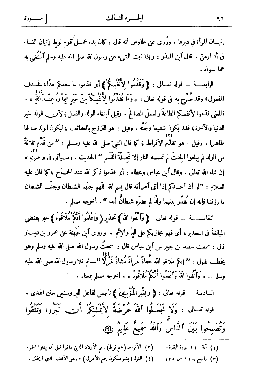 «١» " .. فَالْمَعْنَى قَدِّمُوا لِأَنْفُسِكُمُ الطَّاعَةَ وَالْعَمَلَ الصَّالِحَ. وَقِيلَ ابْتِغَاءُ الْوَلَدِ وَالنَّسْلِ، لِأَنَّ الْوَلَدَ خَيْرُ الدُّنْيَا وَالْآخِرَةِ، فَقَدْ يَكُونُ شَفِيعًا وَجُنَّةً. وَقِيلَ: هُوَ التَّزَوُّجُ بِالْعَفَائِفِ، لِيَكُونَ الْوَلَدُ صَالِحًا طَاهِرًا. وَقِيلَ: هُوَ تَقَدُّمُ «٢» الْأَفْرَاطِ، كَمَا قَالَ النَّبِيُّ صَلَّى اللَّهُ عَلَيْهِ وَسَلَّمَ:" مَنْ قَدَّمَ ثَلَاثَةً مِنَ الْوَلَدِ لَمْ يَبْلُغُوا الْحِنْثَ لَمْ تَمَسَّهُ النَّارُ إِلَّا تَحِلَّةَ الْقَسَمِ" الْحَدِيثَ. وَسَيَأْتِي فِي" مَرْيَمَ «٣» " إِنْ شَاءَ اللَّهُ تَعَالَى. وَقَالَ ابْنُ عَبَّاسٍ وَعَطَاءٌ: أَيْ قَدِّمُوا ذِكْرَ اللَّهِ عِنْدَ الْجِمَاعِ، كَمَا قَالَ عَلَيْهِ السَّلَامُ:" لَوْ أَنَّ أَحَدَكُمْ إِذَا أَتَى امْرَأَتَهُ قَالَ بِسْمِ اللَّهِ اللَّهُمَّ جَنِّبْنَا الشَّيْطَانَ وجنب الشيطان ما رزقتنا فإنه إن يقدر بَيْنَهُمَا وَلَدٌ لَمْ يَضُرَّهُ شَيْطَانٌ أَبَدًا". أَخْرَجَهُ مُسْلِمٌ. الْخَامِسَةُ- قَوْلُهُ تَعَالَى: (وَاتَّقُوا اللَّهَ) تَحْذِيرٌ (وَاعْلَمُوا أَنَّكُمْ مُلاقُوهُ) خَبَرٌ يَقْتَضِي الْمُبَالَغَةَ فِي التَّحْذِيرِ، أَيْ فَهُوَ مُجَازِيكُمْ عَلَى الْبِرِّ وَالْإِثْمِ. وَرَوَى ابْنُ عُيَيْنَةَ عَنْ عَمْرِو بْنِ دِينَارٍ قَالَ: سَمِعْتُ سَعِيدَ بْنَ جُبَيْرٍ عَنِ ابْنِ عَبَّاسٍ قَالَ: سَمِعْتُ رَسُولَ اللَّهِ صَلَّى اللَّهُ عَلَيْهِ وَسَلَّمَ وَهُوَ يَخْطُبُ يَقُولُ:" إِنَّكُمْ مُلَاقُو اللَّهِ حُفَاةً عُرَاةً مُشَاةً غُرْلًا «٤» "- ثُمَّ تَلَا رَسُولُ اللَّهِ صَلَّى اللَّهُ عَلَيْهِ وَسَلَّمَ-" وَاتَّقُوا اللَّهَ وَاعْلَمُوا أَنَّكُمْ مُلاقُوهُ". أَخْرَجَهُ مُسْلِمٌ بِمَعْنَاهُ. السَّادِسَةُ- قَوْلُهُ تَعَالَى: (وَبَشِّرِ الْمُؤْمِنِينَ) تَأْنِيسٌ لِفَاعِلِ البر ومبتغى سنن الهدى.