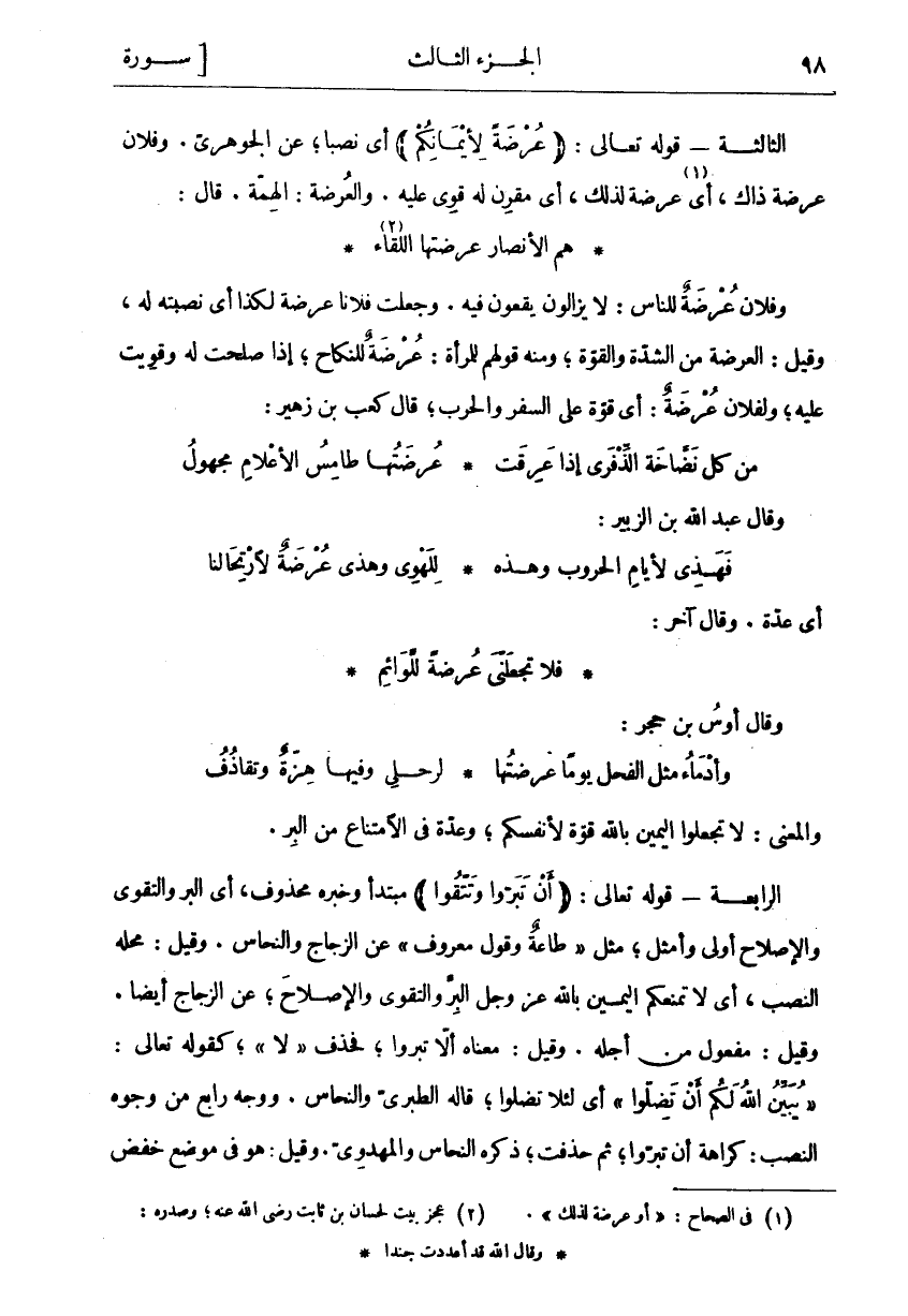 وَالْمَعْنَى: لَا تَجْعَلُوا الْيَمِينَ بِاللَّهِ قُوَّةً لِأَنْفُسِكُمْ، وَعُدَّةً فِي الِامْتِنَاعِ مِنَ الْبِرِّ. الرَّابِعَةُ- قَوْلُهُ تَعَالَى: (أَنْ تَبَرُّوا وَتَتَّقُوا) مُبْتَدَأٌ وَخَبَرُهُ مَحْذُوفٌ، أَيِ الْبِرُّ وَالتَّقْوَى وَالْإِصْلَاحُ أَوْلَى وَأَمْثَلُ، مِثْلَ" طاعَةٌ وَقَوْلٌ مَعْرُوفٌ" عَنِ الزَّجَّاجِ وَالنَّحَّاسِ. وَقِيلَ: مَحَلُّهُ النَّصْبُ، أَيْ لَا تَمْنَعُكُمُ الْيَمِينُ بِاللَّهِ عَزَّ وَجَلَّ الْبِرَّ وَالتَّقْوَى وَالْإِصْلَاحَ، عَنِ الزَّجَّاجِ أَيْضًا. وَقِيلَ: مَفْعُولٌ مِنْ أَجْلِهِ. وَقِيلَ: مَعْنَاهُ أَلَّا تَبَرُّوا، فَحَذَفَ" لَا"، كَقَوْلِهِ تَعَالَى:" يُبَيِّنُ اللَّهُ لَكُمْ أَنْ تَضِلُّوا" أَيْ لِئَلَّا تَضِلُّوا، قَالَهُ الطَّبَرِيُّ وَالنَّحَّاسُ. وَوَجْهٌ رَابِعٌ مِنْ وُجُوهِ النَّصْبِ: كَرَاهَةَ أَنْ تَبَرُّوا، ثُمَّ حُذِفَتْ، ذَكَرَهُ النَّحَّاسُ وَالْمَهْدَوِيُّ. وَقِيلَ: هو في موضع خفض