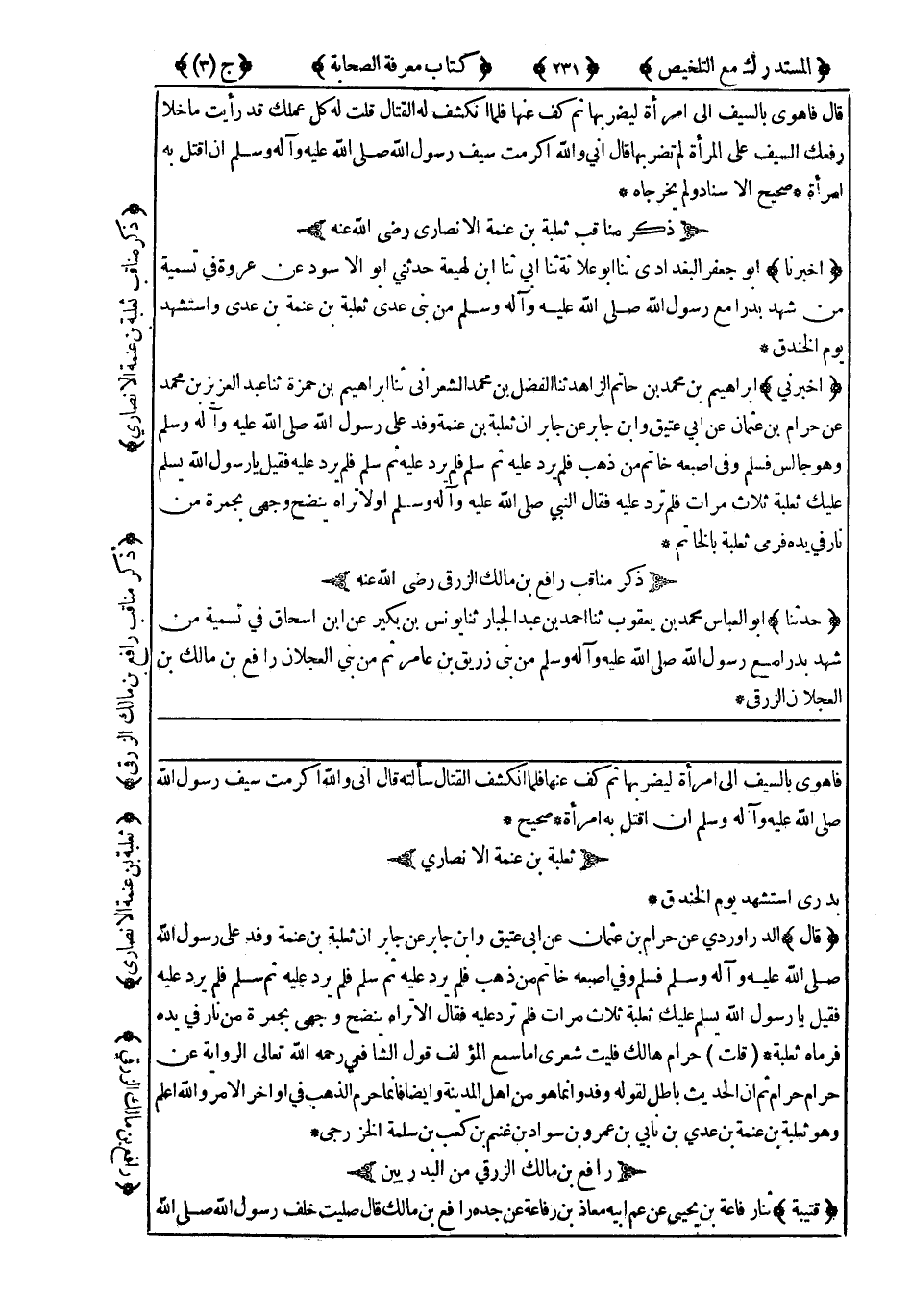 5021- أَخْبَرَنِي إِبْرَاهِيمُ بْنُ مُحَمَّدِ بْنِ حَاتِمٍ الزَّاهِدُ ، حَدَّثَنَا الْفَضْلُ بْنُ مُحَمَّدٍ الشَّعْرَانِيُّ ، حَدَّثَنَا إِبْرَاهِيمُ بْنُ حَمْزَةَ ، حَدَّثَنَا عَبْدُ الْعَزِيزِ بْنُ مُحَمَّدٍ ، عَنْ حَرَامِ بْنِ عُثْمَانَ ، عَنْ أَبِي عَتِيقٍ ، وَابْنِ جَابِرٍ ، عَنْ جَابِرٍ ، أَنَّ ثَعْلَبَةَ بْنَ عَنَمَةَ وَفَدَ عَلَى رَسُولِ اللهِ صَلَّى اللَّهُ عَلَيْهِ وَسَلَّمَ وَهُوَ جَالِسٌ ، فَسَلَّمَ وَفِي إِصْبَعِهِ خَاتَمٌ مِنْ ذَهَبٍ ، فَلَمْ يَرُدَّ عَلَيْهِ ، ثُمَّ سَلَّمَ عَلَيْهِ فَلَمْ يَرُدَّ عَلَيْهِ ، فَقِيلَ : يَا رَسُولَ اللهِ ، يُسَلِّمُ عَلَيْكَ ثَعْلَبَةُ ثَلاَثَ مَرَّاتٍ فَلَمْ تُرَدَّ عَلَيْهِ ، فَقَالَ النَّبِيُّ صَلَّى اللَّهُ عَلَيْهِ وَسَلَّمَ : أَوْ لاَ تَرَاهُ يَنْضَحُ وَجْهِي بِجَمْرَةٍ مِنْ نَارٍ فِي يَدِهِ فَرَمَى ثَعْلَبَةُ بِالْخَاتَمِ.