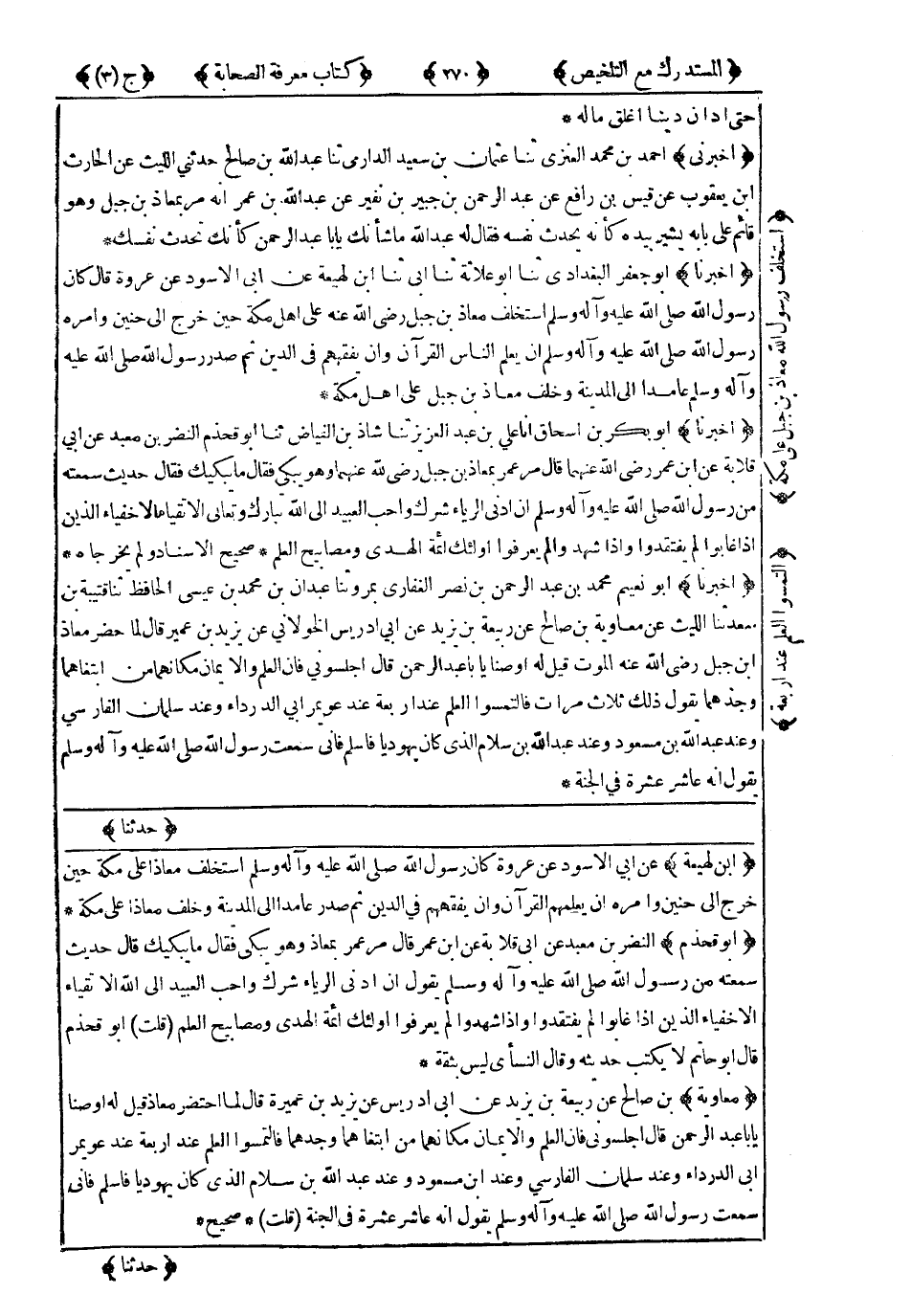 5183- أَخْبَرَنَا أَبُو نُعَيْمٍ مُحَمَّدُ بْنُ عَبْدِ الرَّحْمَنِ بْنِ نَصْرٍ الْغِفَارِيُّ بِمَرْوَ ، حَدَّثَنَا عَبْدَانُ بْنُ مُحَمَّدِ بْنِ عِيسَى الْحَافِظُ ، حَدَّثَنَا قُتَيْبَةُ بْنُ سَعْدٍ ، حَدَّثَنَا اللَّيْثُ ، عَنْ مُعَاوِيَةَ بْنِ صَالِحٍ ، عَنْ رَبِيعَةَ بْنِ يَزِيدَ ، عَنْ أَبِي إِدْرِيسَ الْخَوْلاَنِيِّ ، عَنْ يَزِيدَ بْنِ عُمَيْرٍ قَالَ : لَمَّا حَضَرَ مُعَاذَ بْنَ جَبَلٍ رَضِيَ اللَّهُ عَنْهُ الْمَوْتُ قِيلَ لَهُ : أَوْصِنَا يَا أَبَا عَبْدِ الرَّحْمَنِ ، قَالَ : أَجْلِسُونِي ، فَإِنَّ الْعِلْمَ وَالإِيمَانَ مَكَانَهُمَا مَنَ ابْتَغَاهُمَا وَجَدَهُمَا ، يَقُولُ ذَلِكَ ثَلاَثَ مَرَّاتٍ ، فَالْتَمِسُوا الْعِلْمَ عِنْدَ أَرْبَعَةٍ : عِنْدَ عُوَيْمِرٍ أَبِي الدَّرْدَاءِ ، وَعِنْدَ سَلْمَانَ الْفَارِسِيِّ ، وَعِنْدَ عَبْدِ اللهِ بْنِ مَسْعُودٍ ، وَعِنْدَ عَبْدِ اللهِ بْنِ سَلاَمٍ الَّذِي كَانَ يَهُودِيًّا فَأَسْلَمَ ، فَإِنِّي سَمِعْتُ رَسُولَ اللهِ صَلَّى اللَّهُ عَلَيْهِ وَسَلَّمَ ، يَقُولُ : أَنَّهُ عَاشِرُ عَشْرَةٍ فِي الْجَنَّةِ.