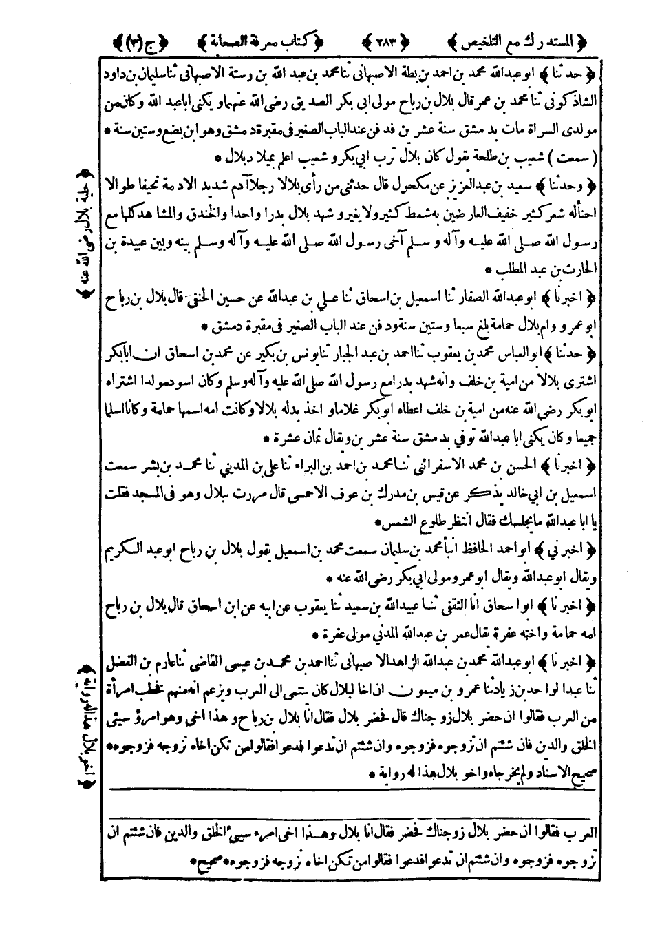 5232- أَخْبَرَنَا أَبُو عَبْدِ اللهِ الصَّفَّارُ ، حَدَّثَنَا إِسْمَاعِيلُ بْنُ إِسْحَاقَ ، حَدَّثَنَا عَلِيُّ بْنُ عَبْدِ اللهِ ، عَنْ حُسَيْنٍ الْحَنَفِيِّ قَالَ : بِلاَلُ بْنُ رَبَاحٍ أَبُو عَمْرٍو ، وَأُمُّ بِلاَلٍ حَمَامَةُ بَلَغَ سَبْعًا وَسِتِّينَ سَنَةً وَدُفِنَ عِنْدَ الْبَابِ الصَّغِيرِ فِي مَقْبَرَةِ دِمَشْقَ.