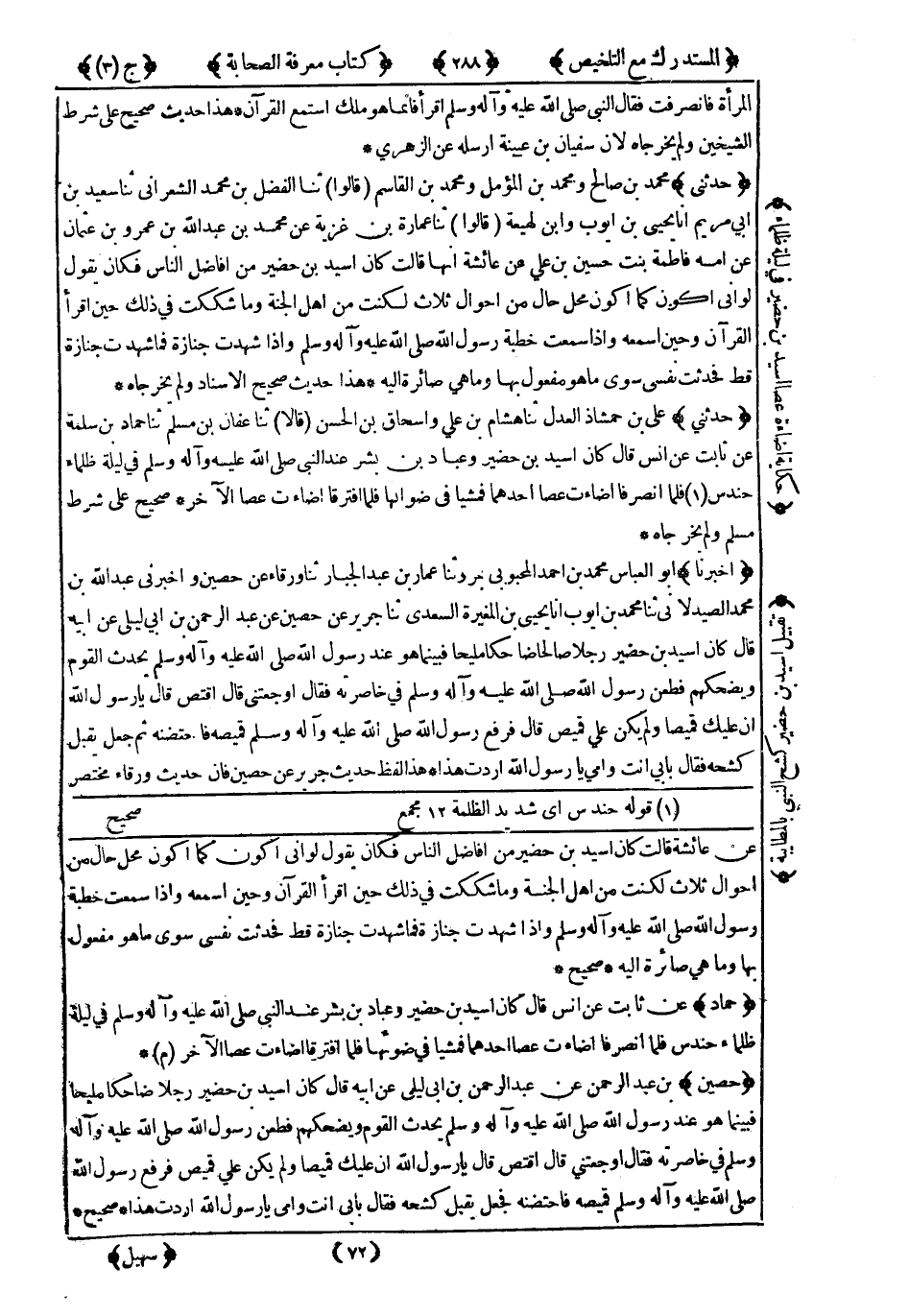 5261- حَدَّثَنِي عَلِيُّ بْنُ حَمْشَاذَ الْعَدْلُ ، حَدَّثَنَا هِشَامُ بْنُ عَلِيٍّ ، وَإِسْحَاقُ بْنُ الْحَسَنِ ، قَالاَ : حَدَّثَنَا عَفَّانُ بْنُ مُسْلِمٍ ، حَدَّثَنَا حَمَّادُ بْنُ سَلَمَةَ ، عَنْ ثَابِتٍ ، عَنْ أَنَسٍ قَالَ : كَانَ أُسَيْدُ بْنُ حُضَيْرٍ ، وَعَبَّادُ بْنُ بِشْرٍ عِنْدَ النَّبِيِّ صَلَّى اللَّهُ عَلَيْهِ وَسَلَّمَ فِي لَيْلَةٍ ظَلْمَاءَ حِنْدِسٍ فَلَمَّا انْصَرَفَا أَضَاءَتْ عَصَا أَحَدِهُمَا ، فَمَشِيَا فِي ضَوْءِهَا فَلَمَّا افْتَرَقَا أَضَاءَتْ عَصَا الآخَرُ.
