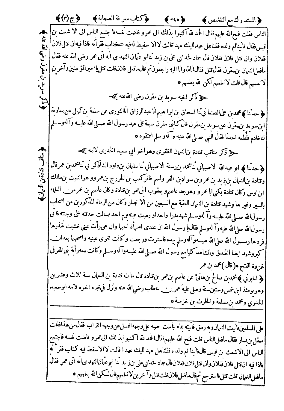 5281- حَدَّثَنَا أَبُو عَبْدِ اللهِ الأَصْبَهَانِيُّ ، حَدَّثَنَا مُحَمَّدُ بْنُ رُسْتَةَ الأَصْبَهَانِيُّ ، حَدَّثَنَا سُلَيْمَانُ بْنُ دَاوُدَ الشَّاذَكُونِيُّ ، حَدَّثَنَا مُحَمَّدُ بْنُ عُمَرَ ، قَالَ : وَقَتَادَةُ بْنُ النُّعْمَانِ بْنِ يَزِيدَ بْنِ عَمْرِو بْنِ سَوَّادِ بْنِ ظَفَرٍ ، وَاسْمُ ظُفُرٍ : كَعْبُ بْنُ الْخَزْرَجِ بْنِ عَمْرٍو وَهُوَ النَّبِيتُ بْنُ مَالِكِ بْنِ أَوْسٍ وَكَانَ قَتَادَةُ يُكَنَّى أَبَا عَمْرٍو وَهُوَ جَدُّ عَاصِمٍ وَيَعْقُوبَ ابْنِيْ عُمَرَ بْنِ قَتَادَةَ ، وَكَانَ عَاصِمُ بْنُ عُمَرَ مِنَ الْعُلَمَاءِ بِالسِّيَرِ وَغَيْرِهَا وَشَهِدَ قَتَادَةُ بْنُ النُّعْمَانِ الْعَقَبَةَ مَعَ السَّبْعِينَ مِنَ الأَنْصَارِ ، وَكَانَ مِنَ الرُّمَاةِ الْمَذْكُورِينَ مِنْ أَصْحَابِ رَسُولِ اللهِ صَلَّى اللَّهُ عَلَيْهِ وَسَلَّمَ ، شَهِدَ بَدْرًا وَأُحُدًا وَرُمِيَتْ عَيْنَهُ يَوْمَ أُحُدٍ ، فَسَالَتْ حَدَقَتُهُ عَلَى وَجْنَتِهِ ، فَأَتَى رَسُولَ اللهِ صَلَّى اللَّهُ عَلَيْهِ وَسَلَّمَ ، فَقَالَ : يَا رَسُولَ اللهِ ، إِنَّ عِنْدِي امْرَأَةً أُحِبُّهَا ، وَإِنْ هِيَ رَأَتْ عَيْنِي خَشِيتُ تَقْذَرُهَا ، فَرَدَّهَا رَسُولُ اللهِ بِيَدِهِ ، فَاسْتَوَتْ وَرَجَعَتْ ، وَكَانَتْ أَقْوَى عَيْنَيْهِ وَأَصَحَّهُمَا بَعْدَ أَنْ كَبِرَ ، وَشَهِدَ أَيْضًا الْخَنْدَقَ وَالْمَشَاهِدَ كُلَّهَا مَعَ رَسُولِ اللهِ صَلَّى اللَّهُ عَلَيْهِ وَسَلَّمَ ، وَكَانَتْ مَعَهُ رَايَةُ بَنِي ظُفُرٍ فِي غَزْوَةِ الْفَتْحِ.