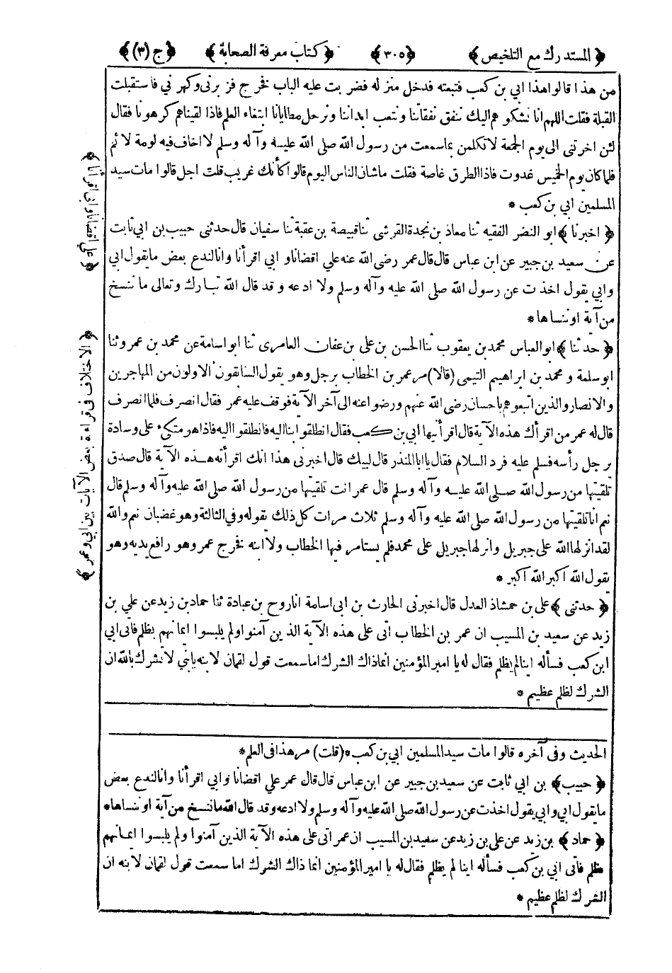 5330- حَدَّثَنِي عَلِيُّ بْنُ حَمْشَاذَ الْعَدْلُ ، قَالَ : أَخْبَرَنِي الْحَارِثُ بْنُ أَبِي أُسَامَةَ ، أَنَا رَوْحُ بْنُ عُبَادَةَ ، حَدَّثَنَا حَمَّادُ بْنُ زَيْدٍ ، عَنْ عَلِيِّ بْنِ زَيْدٍ ، عَنْ سَعِيدِ بْنِ الْمُسَيَّبِ ، أَنَّ عُمَرَ بْنَ الْخَطَّابِ أَتَى عَلَى هَذِهِ الآيَةِ : {الَّذِينَ آمَنُوا وَلَمْ يُلْبِسُوا إِيمَانَهُمْ بِظُلْمٍ} فَأَتَى أُبَيَّ بْنَ كَعْبٍ فَسَأَلَهُ : أَيُّنَا لَمْ يَظْلِمْ ؟ فَقَالَ لَهُ : يَا أَمِيرَ الْمُؤْمِنِينَ ، إِنَّمَا ذَاكَ الشِّرْكُ ، أَمَا سَمِعْتَ قَوْلَ لُقْمَانَ لِابْنِهِ : {يَا بُنَيَّ لاَ تُشْرِكْ بِاللَّهِ إِنَّ الشِّرْكَ لَظُلْمٌ عَظِيمٌ}.