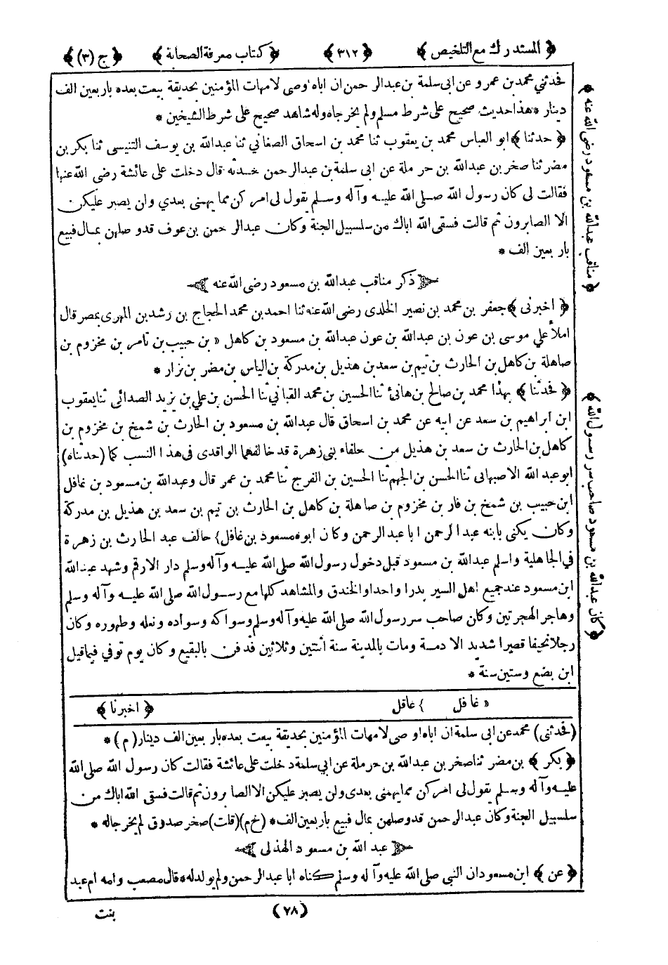 حَدَّثَنَاهُ أَبُو عَبْدِ اللهِ الأَصْبَهَانِيُّ ، حَدَّثَنَا الْحَسَنُ بْنُ الْجَهْمِ ، حَدَّثَنَا الْحُسَيْنُ بْنُ الْفَرَجِ ، حَدَّثَنَا مُحَمَّدُ بْنُ عُمَرَ قَالَ : وَعَبْدُ اللهِ بْنُ مَسْعُودِ بْنِ غَافِلِ بْنِ حَبِيبِ بْنِ شَمْخِ بْنِ فَارِّ بْنِ مَخْزُومِ بْنِ صَاهِلَةَ بْنِ كَاهِلِ بْنِ الْحَارِثِ بْنِ تَيْمِ بْنِ سَعْدِ بْنِ هُذَيْلِ بْنِ مُدْرِكَةَ ، وَكَانَ يُكَنَّى بِابْنِهِ عَبْدِ الرَّحْمَنِ : أَبَا عَبْدِ الرَّحْمَنِ ، وَكَانَ أَبُوهُ مَسْعُودُ بْنُ غَافِلٍ حَالَفَ عَبْدَ الْحَارِثِ بْنَ زُهْرَةَ فِي الْجَاهِلِيَّةِ ، وَأَسْلَمَ عَبْدُ اللهِ بْنُ مَسْعُودٍ قَبْلَ دُخُولِ رَسُولِ اللهِ صَلَّى اللَّهُ عَلَيْهِ وَسَلَّمَ دَارَ الأَرْقَمِ ، وَشَهِدَ عَبْدُ اللهِ بْنُ مَسْعُودٍ عِنْدَ جَمِيعِ أَهْلِ السِّيَرِ بَدْرًا وأُحُدًا ، وَالْخَنْدَقَ وَالْمَشَاهِدَ كُلَّهَا مَعَ رَسُولِ اللهِ صَلَّى اللَّهُ عَلَيْهِ وَسَلَّمَ ، وَهَاجَرَ الْهِجْرَتَيْنِ ، وَكَانَ صَاحِبَ سِرِّ رَسُولِ اللهِ صَلَّى اللَّهُ عَلَيْهِ وَسَلَّمَ ، وَسِوَاكِهِ ، وَسَوَادِهِ ، وَنَعْلِهِ ، وَطَهُورَهُ ، وَكَانَ رَجُلاً نَحِيفًا قَصِيرًا شَدِيدَ الأَدَمَةِ ، وَمَاتَ بِالْمَدِينَةِ سَنَةَ اثْنَتَيْنِ وَثَلاَثِينَ ، فَدُفِنَ بِالْبَقِيعِ ، وَكَانَ يَوْمَ تُوُفِّيَ فِيمَا قِيلَ ابْنُ بِضْعٍ وَسِتِّينَ سَنَةً.