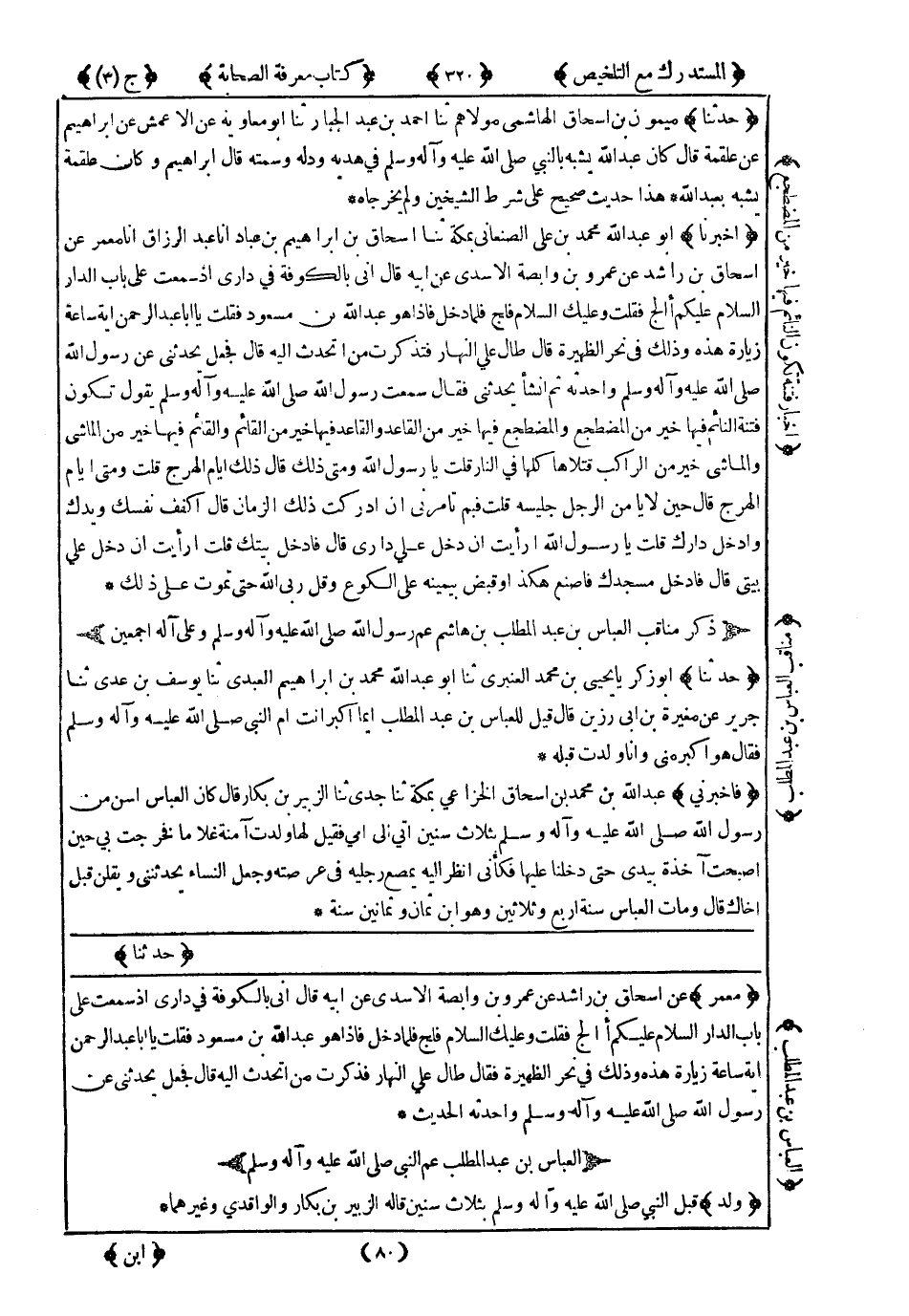 5399- فَأَخْبَرَنِي عَبْدُ اللهِ بْنُ مُحَمَّدِ بْنِ إِسْحَاقَ الْخُزَاعِيُّ ، بِمَكَّةَ ، حَدَّثَنَا جَدِّي ، حَدَّثَنَا الزُّبَيْرُ بْنُ بَكَّارٍ ، قَالَ : كَانَ الْعَبَّاسُ أَسَنَّ مِنْ رَسُولِ اللهِ صَلَّى اللَّهُ عَلَيْهِ وَسَلَّمَ بِثَلاَثِ سِنِينَ أُتِيَ إِلَى أُمِّي فَقِيلَ لَهَا : وَلَدَتْ آمِنَةُ غُلاَمًا فَخَرَجَتْ بِي حِينَ أَصْبَحْتُ آخِذَةً بِيَدِي حَتَّى دَخَلْنَا عَلَيْهَا ، فَكَأَنِّي أَنْظُرُ إِلَيْهِ يَمْصَعُ رِجْلَيْهِ فِي عَرْصَتِهِ وَجَعَلَ النِّسَاءُ يُحَدِّثْنَنِي وَيَقُلْنَ : قَبِّلْ أَخَاكَ ، قَالَ : وَمَاتَ الْعَبَّاسُ سَنَةَ أَرْبَعٍ وَثَلاَثِينَ وَهُوَ ابْنُ ثَمَانٍ وَثَمَانِينَ سَنَةً.