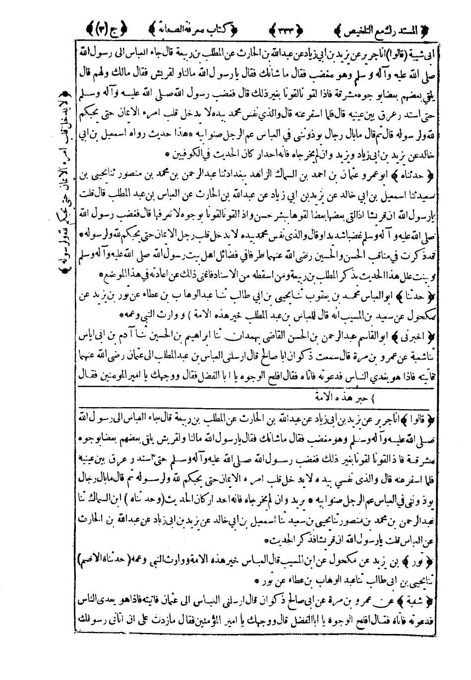 5433- حَدَّثَنَاهُ أَبُو عَمْرٍو عُثْمَانُ بْنُ أَحْمَدَ بْنِ السَّمَّاكِ الزَّاهِدُ ، بِبَغْدَادَ ، حَدَّثَنَا عَبْدُ الرَّحْمَنِ بْنُ مُحَمَّدِ بْنِ مَنْصُورٍ ، حَدَّثَنَا يَحْيَى بْنُ سَعِيدٍ ، حَدَّثَنَا إِسْمَاعِيلُ بْنُ أَبِي خَالِدٍ ، عَنْ يَزِيدَ بْنِ أَبِي زِيَادٍ ، عَنْ عَبْدِ اللهِ بْنِ الْحَارِثِ ، عَنِ الْعَبَّاسِ بْنِ عَبْدِ الْمُطَّلِبِ ، قَالَ : قُلْتُ : يَا رَسُولَ اللهِ ، إِنَّ قُرَيْشًا إِذَا لَقِيَ بَعْضُهَا بَعْضًا لَقُوهَا بِبِشْرٍ حَسَنٍ ، وَإِذَا لَقُونَا لَقُونَا بِوُجُوهٍ لاَ نَعْرِفُهَا ، قَالَ : فَغَضِبَ رَسُولُ اللهِ صَلَّى اللَّهُ عَلَيْهِ وَسَلَّمَ غَضَبًا شَدِيدًا ، وَقَالَ : وَالَّذِي نَفْسُ مُحَمَّدٍ بِيَدِهِ لاَ يَدْخُلُ قَلْبُ رَجُلٍ الإِيمَانُ حَتَّى يُحِبَّكُمْ لِلَّهِ وَلِرَسُولِهِ.