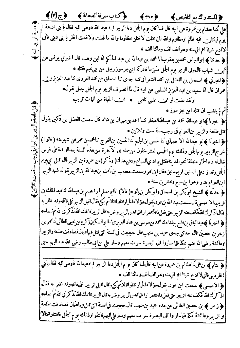 5572- أَخْبَرَنَا عَبْدُ الْبَاقِي بْنُ قَانِعٍ ، بِبَغْدَادَ ، حَدَّثَنَا مُحَمَّدُ بْنُ مُوسَى بْنِ حَمَّادٍ الْبَرْبَرِيُّ ، حَدَّثَنَا أَبُو السِّكِّينِ زَكَرِيَّا بْنُ يَحْيَى الطَّائِيُّ ، حَدَّثَنَا عُمَرُ بْنُ زَحْرِ بْنِ حُصَيْنٍ ، قَالَ : حَدَّثَنِي جَدِّي حُمَيْدُ بْنُ مُنْهِبٍ قَالَ : حَجَجْتُ فِي السَّنَةِ الَّتِي قُتِلَ فِيهَا عُثْمَانُ فَصَادَفْتُ طَلْحَةَ وَالزُّبَيْرَ وَعَائِشَةَ رَضِيَ اللَّهُ عَنْهُمْ بِمَكَّةَ ، فَلَمَّا سَارُوا إِلَى الْبَصْرَةِ سِرْتُ مَعَهُمْ ، وَسَارَ عَلِيُّ بْنُ أَبِي طَالِبٍ رَضِيَ اللَّهُ عَنْهُ إِلَيْهِمْ حَتَّى الْتَقَوْا ، وَذَلِكَ يَوْمَ الْجَمَلِ فَاقْتَتَلُوا قِتَالاً شَدِيدًا ، وَأَخَذَ بِخِطَامِ الْجَمَلِ يَوْمَئِذٍ سَبْعُونَ رَجُلاً ، - وَذَكَرَ الْحَدِيثَ بِطُولِهِ وَقَالَ فِي آخِرِهِ - وَوَلَّى الزُّبَيْرُ مُنْهَزِمًا ، فَأَدْرَكَهُ ابْنُ جُرْمُوزٍ وَهُوَ رَجُلٌ مِنْ بَنِي تَمِيمٍ فَقَتَلَهُ.