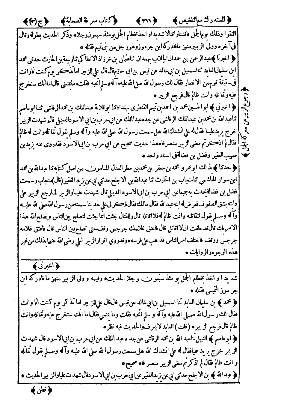 5575- حَدَّثَنَا بِذَلِكَ أَبُو عَمْرٍو مُحَمَّدُ بْنُ جَعْفَرِ بْنِ مُحَمَّدِ بْنِ مَطَرٍ الْعَدْلُ الْمَأْمُونُ مِنْ أَصْلِ كِتَابِهِ ، حَدَّثَنَا عَبْدُ اللهِ بْنُ مُحَمَّدِ بْنِ سَوَّارٍ الْهَاشِمِيُّ ، حَدَّثَنَا مِنْجَابُ بْنُ الْحَارِثِ ، حَدَّثَنَا عَبْدُ اللهِ بْنُ الأَجْلَحِ ، حَدَّثَنِي أَبِي ، عَنْ يَزِيدَ الْفَقِيرِ (ح) قَالَ مِنْجَابٌ : وَسَمِعْتُ فَضْلَ بْنَ فَضَالَةَ ، يُحَدِّثُ بِهِ جَمِيعًا ، عَنْ أَبِي حَرْبِ بْنِ أَبِي الأَسْوَدِ الدِّيلِيِّ ، قَالَ : شَهِدْتُ عَلِيًّا وَالزُّبَيْرَ ، لَمَّا رَجَعَ الزُّبَيْرُ عَلَى دَابَّتِهِ يَشُقُّ الصُّفُوفَ ، فَعَرَضَ لَهُ ابْنُهُ عَبْدُ اللهِ ، فَقَالَ : مَا لَكَ ؟ فَقَالَ : ذَكَرَ لِي عَلِيٌّ حَدِيثًا سَمِعْتُهُ مِنْ رَسُولِ اللهِ صَلَّى اللَّهُ عَلَيْهِ وَسَلَّمَ يَقُولُ : لَتُقَاتِلَنَّهُ وَأَنْتَ ظَالِمٌ لَهُ فَلاَ أُقَاتِلُهُ ، قَالَ : وَلِلْقِتَالِ جِئْتَ ؟ إِنَّمَا جِئْتَ لِتُصْلِحَ بَيْنَ النَّاسِ وَيُصْلِحُ اللَّهُ هَذَا الأَمْرَ بِكَ ، قَالَ : قَدْ حَلَفْتُ أَنْ لاَ أُقَاتِلَ ، قَالَ : فَأَعْتِقْ غُلاَمَكَ جِرْجِسَ وَقِفْ حَتَّى تُصْلِحَ بَيْنَ النَّاسِ ، قَالَ : فَأَعْتَقَ غُلاَمَهُ جِرْجِسَ وَوَقَفَ فَاخْتَلَفَ أَمَرُ النَّاسِ ، فَذَهَبَ عَلَى فَرَسِهِ.