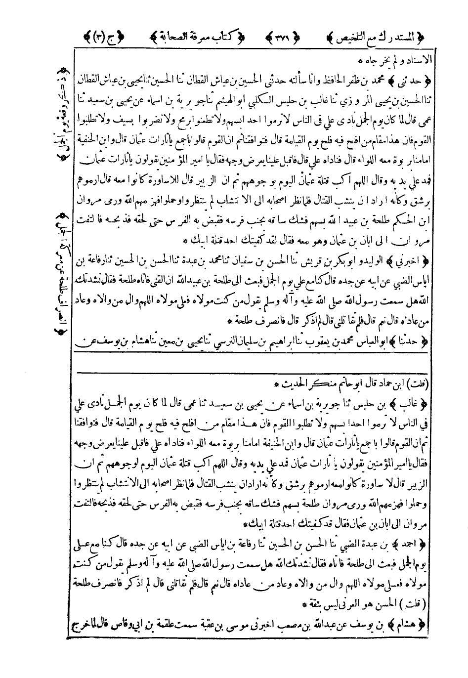 5593- حَدَّثَنِي مُحَمَّدُ بْنُ ظَفَرٍ الْحَافِظُ ، وَأَنَا سَأَلْتُهُ ، حَدَّثَنِي الْحُسَيْنُ بْنُ عَيَّاشٍ الْقَطَّانُ ، حَدَّثَنَا الْحُسَيْنُ ، حَدَّثَنَا يَحْيَى بْنُ عَيَّاشٍ الْقَطَّانُ ، حَدَّثَنَا الْحُسَيْنُ بْنُ يَحْيَى الْمَرْوَزِيُّ ، حَدَّثَنَا غَالِبُ بْنُ حُلَيْسٍ الْكَلْبِيُّ أَبُو الْهَيْثَمِ ، حَدَّثَنَا جُوَيْرِيَةُ بْنُ أَسْمَاءَ ، عَنْ يَحْيَى بْنِ سَعِيدٍ ، حَدَّثَنَا عَمِّي ، قَالَ : لَمَّا كَانَ يَوْمُ الْجَمَلِ نَادَى عَلِيٌّ فِي النَّاسِ : لاَ تَرْمُوا أَحَدًا بِسَهْمٍ ، وَلاَ تَطْعَنُوا بِرُمْحٍ ، وَلاَ تَضْرِبُوا بِسَيْفٍ ، وَلاَ تَطْلُبُوا الْقَوْمَ ، فَإِنَّ هَذَا مَقَامُ مَنْ أَفْلَحَ فِيهِ ، فَلَحَ يَوْمَ الْقِيَامَةِ ، قَالَ : فَتَوَافَقْنَا ، ثُمَّ إِنَّ الْقَوْمَ قَالُوا بِأَجْمَعَ : يَا ثَارَاتِ عُثْمَانَ ، قَالَ : وَابْنُ الْحَنَفِيَّةِ إِمَامُنَا بِرَبْوَةٍ مَعَهُ اللِّوَاءُ ، قَالَ : فَنَادَاهُ عَلِيٌّ قَالَ : فَأَقْبَلَ عَلَيْنَا يَعْرِضُ وَجْهَهُ ، فَقَالَ : يَا أَمِيرَ الْمُؤْمِنِينَ ، يَقُولُونَ : يَا ثَارَاتِ عُثْمَانَ ، فَمَدَّ عَلِيٌّ يَدَيْهِ ، وَقَالَ : اللَّهُمَّ أَكِبَّ قَتَلَةَ عُثْمَانَ الْيَوْمَ بِوُجُوهِهِمْ ، ثُمَّ إِنَّ الزُّبَيْرَ ، قَالَ لِلأَسَاوِرَةِ كَانُوا مَعَهُ قَالَ : ارْمُوهُمْ بِرِشْقٍ ، وَكَأَنَّهُ أَرَادَ أَنْ يَنْشَبَ الْقِتَالُ ، فَلَمَّا نَظَرَ أَصْحَابُهُ إِلَى الِانْتِشَابِ لَمْ يَنْتَظِرُوا وَحَمَلُوا فَهَزَمَهُمُ اللَّهُ ، وَرَمَى مَرْوَانُ بْنُ الْحَكَمِ طَلْحَةَ بْنَ عُبَيْدِ اللهِ بِسَهْمٍ فَشَكَّ سَاقَهُ بِجَنْبِ فَرَسِهِ ، فَقَبَضَ بِهِ الْفَرَسَ حَتَّى لَحِقَهُ فَذَبَحَهُ فَالْتَفَتَ مَرْوَانُ إِلَى أَبَانَ بْنِ عُثْمَانَ وَهُوَ مَعَهُ ، فَقَالَ : لَقَدْ كَفَيْتُكَ أَحَدَ قَتَلَةِ أَبِيكَ.