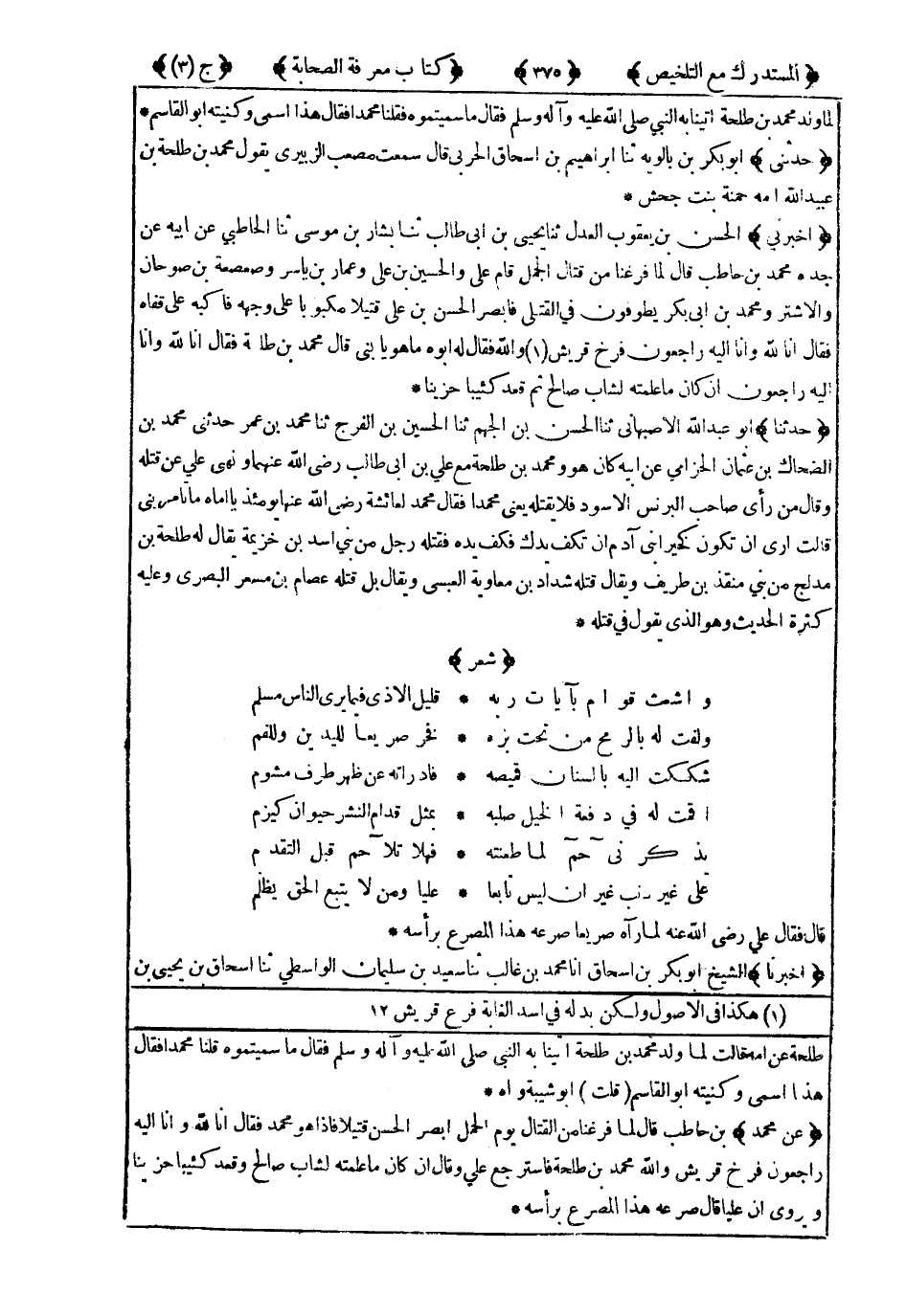 5608- أَخْبَرَنِي الْحَسَنُ بْنُ يَعْقُوبَ ، الْعَدْلُ ، حَدَّثَنَا يَحْيَى بْنُ أَبِي طَالِبٍ ، حَدَّثَنَا بَشَّارُ بْنُ مُوسَى ، حَدَّثَنَا الْحَاطِبِيُّ ، عَنْ أَبِيهِ ، عَنْ جَدِّهِ مُحَمَّدِ بْنِ حَاطِبٍ قَالَ : لَمَّا فَرَغْنَا مِنْ قِتَالِ الْجَمَلِ قَامَ عَلِيٌّ ، وَالْحُسَيْنُ بْنُ عَلِيٍّ ، وَعَمَّارُ بْنُ يَاسِرٍ ، وَصَعْصَعَةُ بْنُ صُوحَانَ ، وَالأَشْتَرُ ، وَمُحَمَّدُ بْنُ أَبِي بَكْرٍ يَطُوفُونَ فِي الْقَتْلَى ، فَأَبْصَرَ الْحَسَنُ بْنُ عَلِيٍّ قَتِيلاً مَكْبُوبًا عَلَى وَجْهِهِ ، فَأَكَبَّهُ عَلَى قَفَاهُ ، فَقَالَ : إِنَّا لِلَّهِ وَإِنَّا إِلَيْهِ رَاجِعُونَ ، فَرْخُ قُرَيْشٍ وَاللَّهِ ، فَقَالَ لَهُ أَبُوهُ : مَا هُوَ يَا بُنَيَّ ؟ قَالَ : مُحَمَّدُ بْنُ طَلْحَةَ ، فَقَالَ : إِنَّا لِلَّهِ وَإِنَّا إِلَيْهِ رَاجِعُونَ ، إِنْ كَانَ مَا عَلِمْتُهُ لَشَابٌّ صَالِحٌ ، ثُمَّ قَعَدَ كَئِيبًا حَزِينًا.