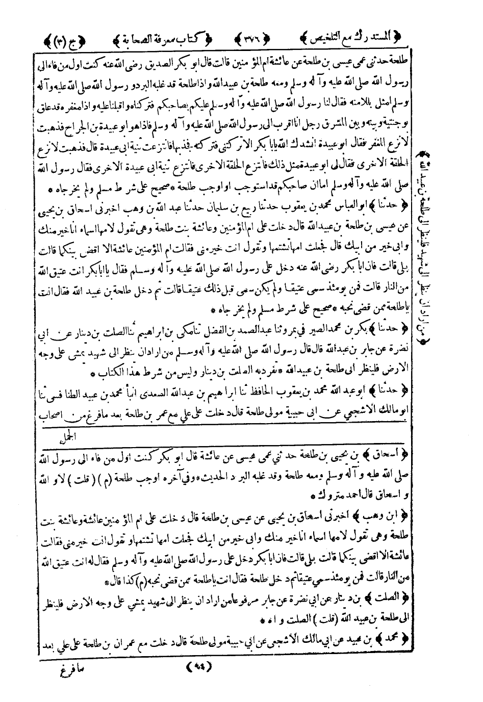5612- حَدَّثَنَا بَكْرُ بْنُ مُحَمَّدٍ الصَّيْرَفِيُّ ، بِمَرْوَ ، حَدَّثَنَا عَبْدُ الصَّمَدِ بْنُ الْفَضْلِ ، حَدَّثَنَا مَكِّيُّ بْنُ إِبْرَاهِيمَ ، حَدَّثَنَا الصَّلْتُ بْنُ دِينَارٍ ، عَنْ أَبِي نَضْرَةَ ، عَنْ جَابِرِ بْنِ عَبْدِ اللهِ قَالَ : قَالَ رَسُولُ اللهِ صَلَّى اللَّهُ عَلَيْهِ وَسَلَّمَ : مَنْ أَرَادَ أَنْ يَنْظُرَ إِلَى شَهِيدٍ يَمْشِي عَلَى وَجْهَ الأَرْضَ فَلْيَنْظُرْ إِلَى طَلْحَةَ بْنَ عُبَيْدِ اللَّهِ.
