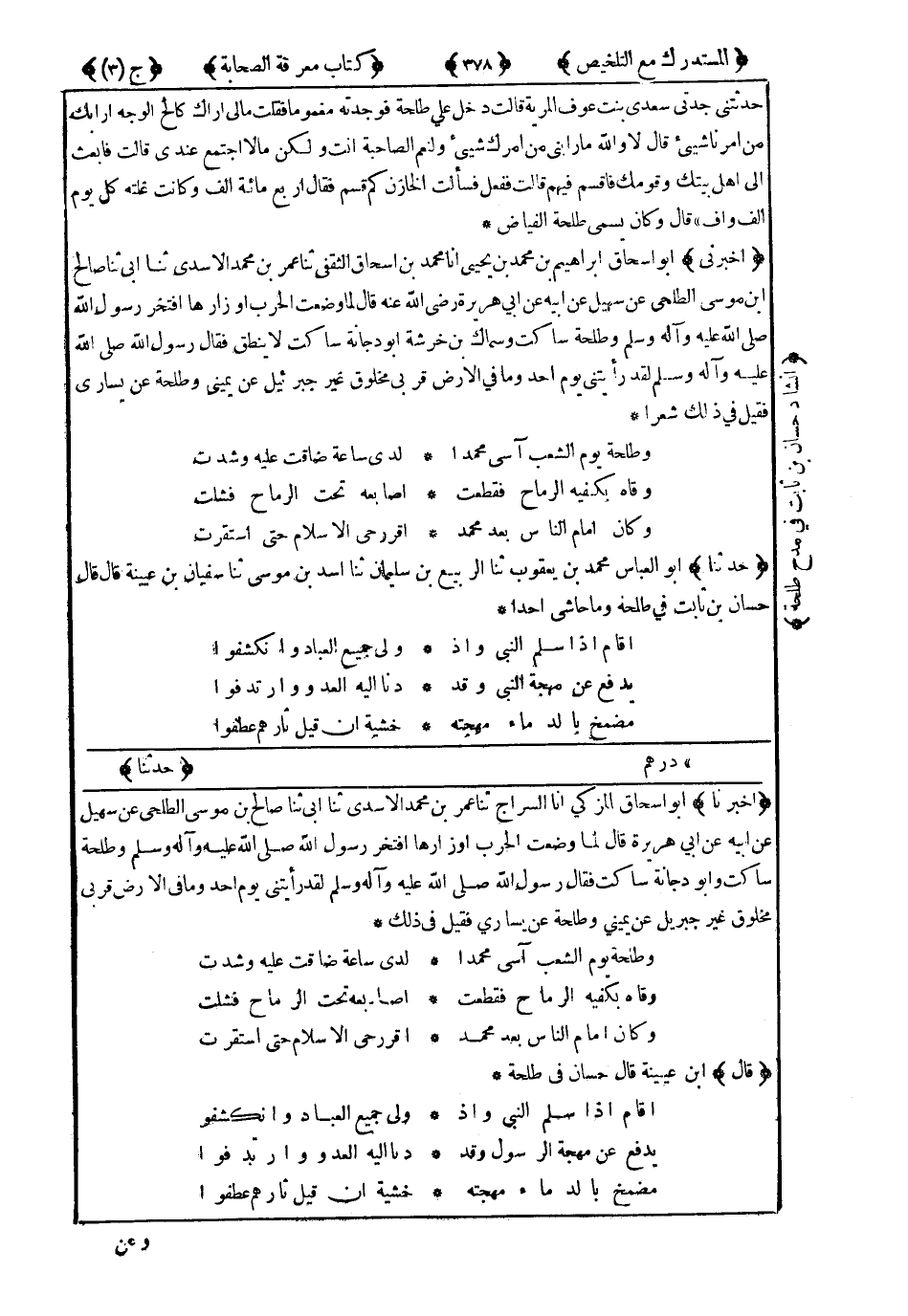 5617- حَدَّثَنَا أَبُو الْعَبَّاسِ مُحَمَّدُ بْنُ يَعْقُوبَ ، حَدَّثَنَا الرَّبِيعُ بْنُ سُلَيْمَانَ ، حَدَّثَنَا أَسَدُ بْنُ مُوسَى ، حَدَّثَنَا سُفْيَانُ بْنُ عُيَيْنَةَ ، قَالَ : قَالَ حَسَّانُ بْنُ ثَابِتٍ فِي طَلْحَةَ وَمَا حَاشَى أَحَدًا:
