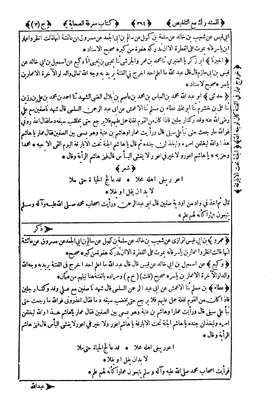 5687- حَدَّثَنِي أَبُو عَبْدِ اللهِ مُحَمَّدُ بْنُ الْعَبَّاسِ بْنِ مُحَمَّدِ بْنِ عَاصِمِ بْنِ بِلاَلٍ الضَّبِّيُّ الشَّهِيدُ ، حَدَّثَنَا أَحْمَدُ بْنُ مُحَمَّدِ بْنِ عَلِيِّ بْنِ رَزِينٍ ، حَدَّثَنَا عَلِيُّ بْنُ خَشْرَمٍ ، حَدَّثَنَا أَبُو مَخْلَدٍ عَطَاءُ بْنُ مُسْلِمٍ ، حَدَّثَنَا الأَعْمَشُ ، عَنْ أَبِي عَبْدِ الرَّحْمَنِ السُّلَمِيِّ ، قَالَ : شَهِدْنَا صِفِّينَ مَعَ عَلِيٍّ رَضِيَ اللَّهُ عَنْهُ ، وَقَدْ وَكَلَّنْا رَجُلَيْنِ ، فَإِذَا كَانَ مِنَ الْقَوْمِ غَفْلَةٌ حَمَلَ عَلَيْهِمْ ، فَلاَ يَرْجِعُ حَتَّى يُخَضِّبَ سَيْفَهُ دَمًا ، فَقَالَ : اعْذُرُونِي فَوَاللَّهِ مَا رَجَعْتُ حَتَّى نَبَا عَلَيَّ سَيْفِي ، قَالَ : وَرَأَيْتُ عَمَّارًا وَهَاشِمَ بْنَ عُتْبَةَ وَهُوَ يَسْعَى بَيْنَ الصَّفَّيْنِ ، فَقَالَ عَمَّارٌ : يَا هَاشِمُ هَذَا وَاللَّهِ لَيُخْلِفَنَّ أَمْرَهُ ، وَلَيَخْذُلَنَّ جُنْدَهُ ، ثُمَّ قَالَ : يَا هَاشِمُ الْجَنَّةُ تَحْتَ الأَبَارِقَةِ ، الْيَوْمَ أَلْقَى الأَحِبَّةَ مُحَمَّدًا وَحِزْبَهُ ، يَا هَاشِمُ أَعْوَرُ ، وَلاَ خَيْرَ فِي أَعْوَرَ لاَ يَغْشَى الْبَأْسَ ، قَالَ : فَهَزَّ هَاشِمٌ الرَّايَةَ وَقَالَ: