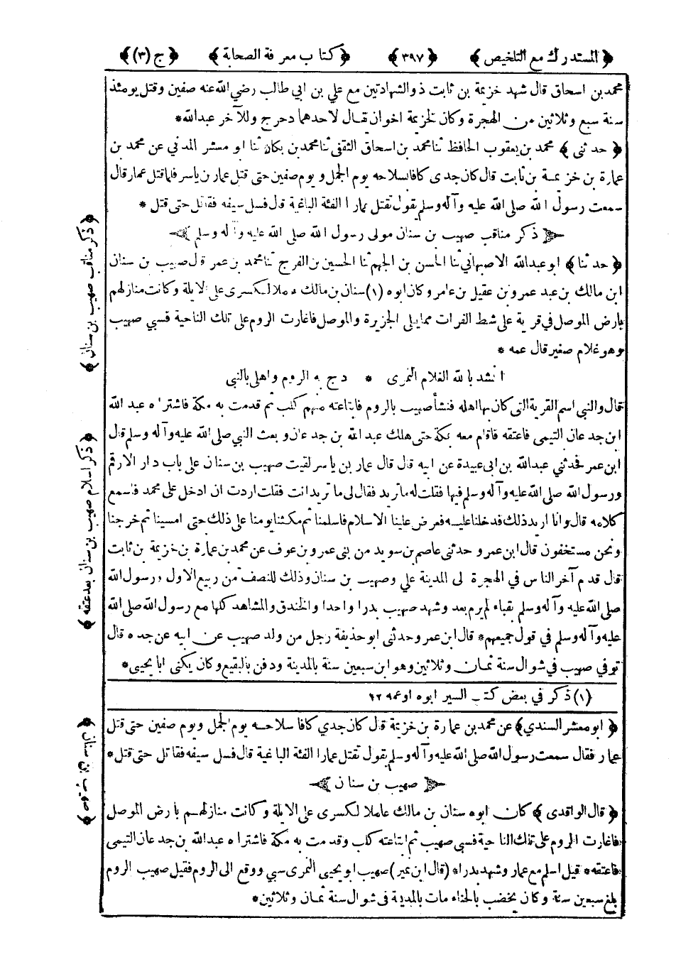 قَالَ : وَالنَّبِيُّ اسْمُ الْقَرْيَةِ الَّتِي كَانَ بِهَا أَهْلُهُ - ، فَنَشَأَ صُهَيْبٌ بِالرُّومِ فَابْتَاعَتْهُ مِنْهُمْ كَلْبٌ ، ثُمَّ قَدِمَتْ بِهِ مَكَّةَ ، فَاشْتَرَاهُ عَبْدُ اللهِ بْنُ جُدْعَانَ التَّيْمِيُّ فَأَعْتَقَهُ ، فَأَقَامَ مَعَهُ بِمَكَّةَ حَتَّى هَلَكَ عَبْدُ اللهِ بْنُ جُدْعَانَ وَبُعِثَ النَّبِيُّ صَلَّى اللَّهُ عَلَيْهِ وَسَلَّمَ. قَالَ ابْنُ عُمَرَ : فَحَدَّثَنِي عَبْدُ اللهِ بْنُ أَبِي عُبَيْدَةَ ، عَنْ أَبِيهِ ، قَالَ : قَالَ عَمَّارُ بْنُ يَاسِرٍ : لَقِيتُ صُهَيْبَ بْنَ سِنَانٍ عَلَى بَابِ دَارِ الأَرْقَمِ ، وَرَسُولُ اللهِ صَلَّى اللَّهُ عَلَيْهِ وَسَلَّمَ فِيهَا ، فَقُلْتُ لَهُ : مَا تُرِيدُ ؟ فَقَالَ لِي : مَا تُرِيدُ أَنْتَ ؟ فَقُلْتُ : أَرَدْتُ أَنْ أَدْخُلَ عَلَى مُحَمَّدٍ ، فَأَسْمَعَ كَلاَمَهُ ، قَالَ : وَأَنَا أُرِيدُ ذَلِكَ فَدَخَلْنَا عَلَيْهِ فَعَرَضَ عَلَيْنَا الإِسْلاَمَ فَأَسْلَمْنَا ، ثُمَّ مَكَثْنَا يَوْمَنَا عَلَى ذَلِكَ حَتَّى أَمْسَيْنَا ، ثُمَّ خَرَجْنَا وَنَحْنُ مُسْتَخْفُونَ قَالَ ابْنُ عُمَرَ : وَحَدَّثَنِي عَاصِمُ بْنُ سُوَيْدٍ مِنْ بَنِي عَمْرِو بْنٍ عَوْفٍ ، عَنْ مُحَمَّدِ بْنِ عُمَارَةَ بْنِ خُزَيْمَةَ بْنِ ثَابِتٍ قَالَ : قَدِمَ آخِرُ النَّاسِ فِي الْهِجْرَةِ إِلَى الْمَدِينَةِ عَلِيٌّ وَصُهَيْبُ بْنُ سِنَانٍ ، وَذَلِكَ لِلنِّصْفِ مِنْ رَبِيعِ الأَوَّلِ ، وَرَسُولُ اللهِ صَلَّى اللَّهُ عَلَيْهِ وَسَلَّمَ بِقُبَاءَ لَمْ يَرِمْ بَعْدُ ، وَشَهِدَ صُهَيْبٌ بَدْرًا ، وأُحُدًا ، وَالْخَنْدَقَ ، وَالْمَشَاهِدَ كُلَّهَا مَعَ رَسُولِ اللهِ صَلَّى اللَّهُ عَلَيْهِ وَسَلَّمَ فِي قَوْلِ جَمِيعِهِمْ.