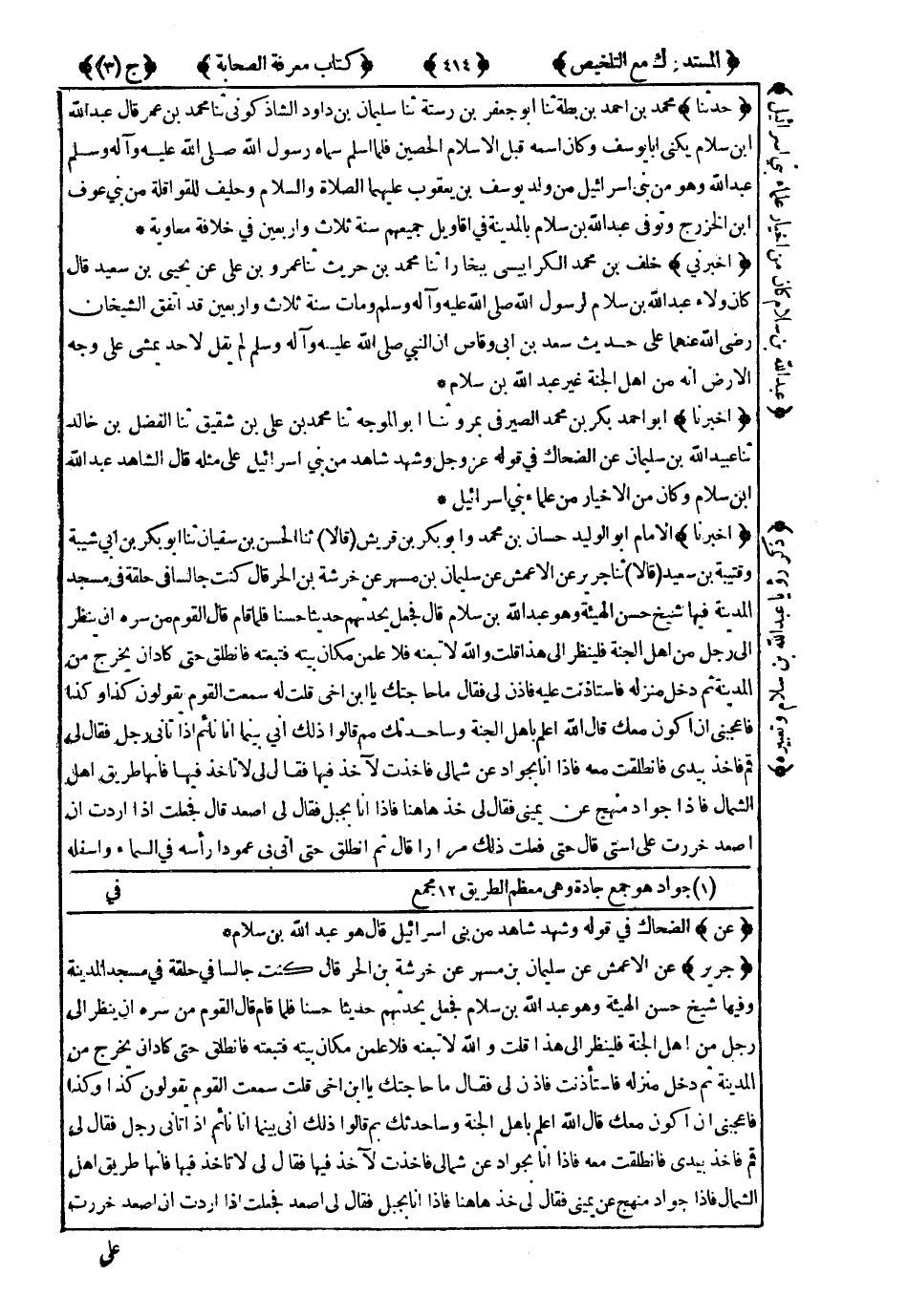 5755- أَخْبَرَنَا الإِمَامُ أَبُو الْوَلِيدِ حَسَّانُ بْنُ مُحَمَّدٍ ، وَأَبُو بَكْرِ بْنُ قُرَيْشٍ قَالاَ : حَدَّثَنَا الْحَسَنُ بْنُ سُفْيَانَ ، حَدَّثَنَا أَبُو بَكْرِ بْنُ أَبِي شَيْبَةَ ، وَقُتَيْبَةُ بْنُ سَعِيدٍ قَالاَ : حَدَّثَنَا جَرِيرٌ ، عَنِ الأَعْمَشِ ، عَنْ سُلَيْمَانَ بْنِ مُسْهِرٍ ، عَنْ خَرَشَةَ بْنِ الْحُرِّ ، قَالَ : كُنْتُ جَالِسًا فِي حَلْقَةٍ فِي مَسْجِدِ الْمَدِينَةِ ، فِيهَا شَيْخٌ حَسَنُ الْهَيْئَةِ ، وَهُوَ عَبْدُ اللهِ بْنُ سَلاَمٍ ، قَالَ : فَجَعَلَ يُحَدِّثُهُمْ حَدِيثًا حَسَنًا ، فَلَمَّا قَامَ ، قَالَ الْقَوْمُ : مَنْ سَرَّهُ أَنْ يَنْظُرَ إِلَى رَجُلٍ مِنْ أَهْلِ الْجَنَّةِ فَلْيَنْظُرْ إِلَى هَذَا ، قُلْتُ : وَاللَّهِ لاَتَّبِعَنَّهُ فَلاَعْلَمَنَّ مَكَانَ بَيْتِهِ فَتَبِعْتُهُ ، فَانْطَلَقَ حَتَّى كَادَ أَنْ يَخْرُجَ مِنَ الْمَدِينَةِ ، ثُمَّ دَخَلَ مَنْزِلَهُ ، فَاسْتَأْذَنْتُ عَلَيْهِ ، فَأَذِنَ لِي ، فَقَالَ : مَا حَاجَتُكَ يَا ابْنَ أَخِي ؟ قُلْتُ لَهُ : سَمِعْتُ الْقَوْمَ يَقُولُونَ : كَذَا وَكَذَا فَأَعْجَبَنِي أَنْ أَكُونَ مَعَكَ ، قَالَ : اللَّهُ أَعْلَمُ بِأَهْلِ الْجَنَّةِ وَسَأُحَدِّثُكَ مِمَّا قَالُوا : قَالُوا ذَلِكَ إِنِّي بَيْنَمَا أَنَا نَائِمٌ إِذْ أَتَانِي رَجُلٌ ، فَقَالَ لِي : قُمْ فَأَخَذَ بِيَدِي فَانْطَلَقْتُ مَعَهُ ، فَإِذَا أَنَا بِجَوَادٍ عَنْ شِمَالِي فَأَخَذْتُ لِآخُذَ فِيهَا ، فَقَالَ لِي : لاَ تَأْخُذْ فِيهَا ، فَإِنَّهَا طَرِيقُ أَهْلِ الشِّمَالِ ، فَإِذَا جَوَادٌ مُنْهَجٌ عَنْ يَمِينِي ، فَقَالَ لِي : خُذْ هَا هُنَا فَإِذَا أَنَا بِجَبَلٍ ، فَقَالَ لِي : اصْعَدْ ، قَالَ : فَجَعَلْتُ إِذَا أَرَدْتُ أَنْ أَصْعَدَ خَرَرْتُ عَلَى إِسْتِي ، قَالَ : حَتَّى فَعَلْتُ ذَلِكَ مِرَارًا ، قَالَ : ثُمَّ انْطَلَقَ حَتَّى أَتَى بِي عَمُودًا رَأْسُهُ فِي السَّمَاءِ وَأَسْفَلُهُ فِي الأَرْضِ فِي أَعْلاَهُ حَلْقَةٌ ، فَقَالَ لِي : اصْعَدْ فَوْقَ هَذَا ، قَالَ : قُلْتُ : كَيْفَ أَصْعَدُ وَرَأْسُهُ فِي السَّمَاءِ ، قَالَ : فَأَخَذَ بِيَدِي فَزَجَلَ بِي ، فَإِذَا أَنَا مُتَعَلِّقٌ بِالْحَلْقَةِ حَتَّى أَصْبَحْتُ ، فَأَتَيْتُ النَّبِيَّ صَلَّى اللَّهُ عَلَيْهِ وَسَلَّمَ فَقَصَصْتُهَا عَلَيْهِ ، فَقَالَ : أَمَا الطَّرِيقُ الَّتِي رَأَيْتَ عَنْ يَسَارِكَ فَهِيَ طَرِيقُ أَهْلِ الشِّمَالِ ، وَأَمَّا الطَّرِيقُ الَّتِي عَنْ يَمِينِكَ فَهِيَ طَرِيقُ أَهْلِ الْيَمَنِ ، وَأَمَّا الْعُرْوَةُ فَهِيَ عُرْوَةُ الإِسْلاَمِ ، فَلَنْ تَزَالَ مُتَمَسِّكًا بِهَا حَتَّى تَمُوتَ.