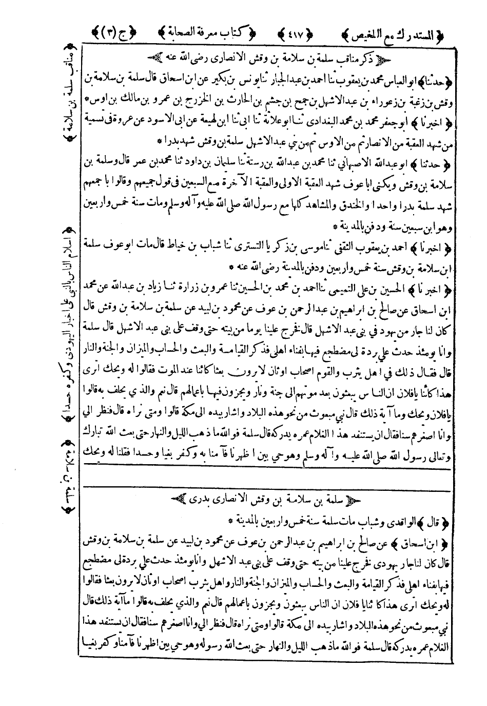 5762- حَدَّثَنَا أَبُو عَبْدِ اللهِ الأَصْبَهَانِيُّ ، حَدَّثَنَا مُحَمَّدُ بْنُ عَبْدِ اللهِ بْنِ رُسْتَةَ ، حَدَّثَنَا سُلَيْمَانُ بْنُ دَاوُدَ ، حَدَّثَنَا مُحَمَّدُ بْنُ عُمَرَ قَالَ : وَسَلَمَةُ بْنُ سَلاَمَةَ بْنِ وَقْشٍ وَيُكَنَّى أَبَا عَوْفٍ شَهِدَ الْعَقَبَةَ الآولَى وَالْعَقَبَةَ الآخِرَةَ مَعَ السَّبْعِينَ فِي قَوْلِ جَمِيعِهِمْ ، وَقَالَ بِأَجْمَعِهِمْ : شَهِدَ سَلَمَةُ بَدْرًا وأُحُدًا وَالْخَنْدَقَ ، وَالْمَشَاهِدَ كُلَّهَا مَعَ رَسُولِ اللهِ صَلَّى اللَّهُ عَلَيْهِ وَسَلَّمَ ، وَمَاتَ سَنَةَ خَمْسٍ وَأَرْبَعِينَ وَهُوَ ابْنُ سَبْعِينَ سَنَةً وَدُفِنَ بِالْمَدِينَةِ.