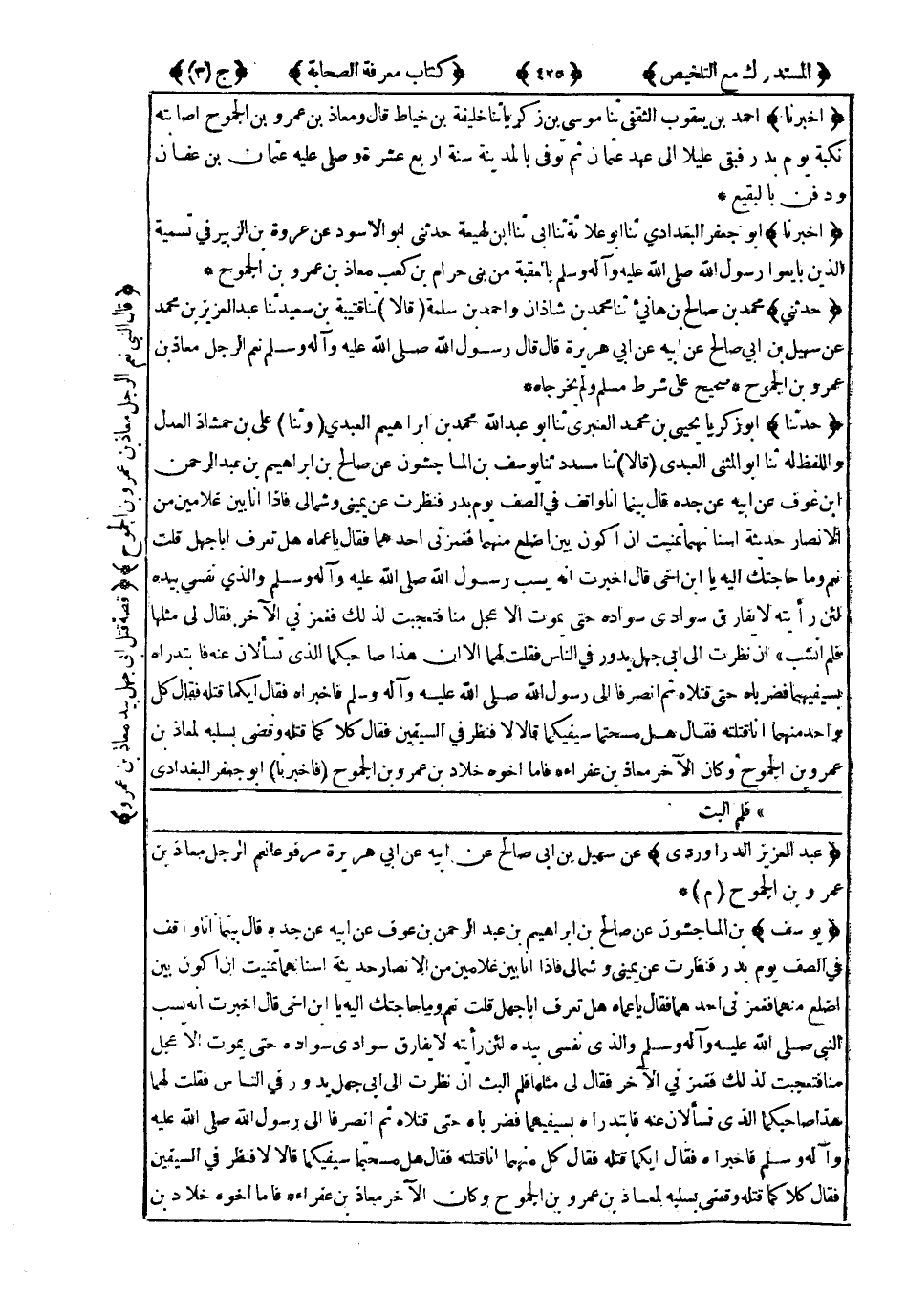 5796- حَدَّثَنَا أَبُو زَكَرِيَّا يَحْيَى بْنُ مُحَمَّدٍ الْعَنْبَرِيُّ ، حَدَّثَنَا أَبُو عَبْدِ اللهِ مُحَمَّدُ بْنُ إِبْرَاهِيمَ الْعَبْدِيُّ (ح) وَثَنَا عَلِيُّ بْنُ حَمْشَاذَ الْعَدْلُ ، وَاللَّفْظُ لَهُ ، حَدَّثَنَا أَبُو الْمُثَنَّى الْعَبْدِيُّ ، قَالاَ : حَدَّثَنَا مُسَدَّدٌ ، حَدَّثَنَا يُوسُفُ بْنُ الْمَاجِشُونِ ، عَنْ صَالِحِ بْنِ إِبْرَاهِيمَ بْنِ عَبْدِ الرَّحْمَنِ بْنِ عَوْفٍ ، عَنْ أَبِيهِ ، عَنْ جَدِّهِ ، قَالَ : بَيْنَمَا أَنَا وَاقِفٌ فِي الصَّفِّ يَوْمَ بَدْرٍ ، فَنَظَرْتُ عَنْ يَمِينِي ، وَشِمَالِي ، فَإِذَا أَنَا بَيْنَ غُلاَمَيْنِ مِنَ الأَنْصَارِ حَدِيثَةٌ أَسْنَانُهُمَا تَمَنَّيْتُ أَنْ أَكُونَ بَيْنَ أَضْلُعٍ مِنْهُمَا ، فَغَمَزَنِي أَحَدُهُمَا فَقَالَ : يَا عَمَّاهُ ، هَلْ تَعْرِفُ أَبَا جَهْلٍ ؟ قُلْتْ : نَعَمْ ، وَمَا حَاجَتُكَ إِلَيْهِ يَا ابْنَ أَخِي ؟ قَالَ : أُخْبِرْتُ أَنَّهُ يَسُبُّ رَسُولَ اللهِ صَلَّى اللَّهُ عَلَيْهِ وَسَلَّمَ ، وَالَّذِي نَفْسِي بِيَدِهِ لَئِنْ رَأَيْتُهُ لاَ يُفَارِقُ سِوَادِي سَوَادَهُ حَتَّى يَمُوتَ إِلاَّ عَجِلَ مِنَّا فَتَعَجَّبْتُ لِذَلِكَ ، فَغَمَزَنِي الآخَرُ ، فَقَالَ لِي مِثْلَهَا ، فَلَمْ أَنْشَبْ أَنْ نَظَرْتُ إِلَى أَبِي جَهْلٍ يَدُورُ فِي النَّاسِ ، فَقُلْتُ لَهُمَا : أَلاَ إِنَّ هَذَا صَاحِبُكُمَا الَّذِي تَسْأَلاَنِ عَنْهُ ، فَابْتَدَرَاهُ بِسَيْفَيْهِمَا فَضَرَبَاهُ حَتَّى قَتَلاَهُ ، ثُمَّ انْصَرَفَا إِلَى رَسُولِ اللهِ صَلَّى اللَّهُ عَلَيْهِ وَسَلَّمَ فَأَخْبَرَاهُ ، فَقَالَ : أَيُّكُمَا قَتَلَهُ ؟ فَقَالَ كُلُّ وَاحِدٍ مِنْهُمَا : أَنَا قَتَلْتُهُ . فَقَالَ : هَلْ مَسَحْتُمَا سَيْفَيْكُمَا ؟ قَالاَ : لاَ ، فَنَظَرَ فِي السَّيْفَيْنِ فَقَالَ : كِلاَكُمَا قَتَلَهُ وَقَضَى بِسَلَبِهِ لِمُعَاذِ بْنِ عَمْرِو بْنِ الْجَمُوحِ وَكَانَ الآخَرُ مُعَاذَ بْنَ عَفْرَاءَ.