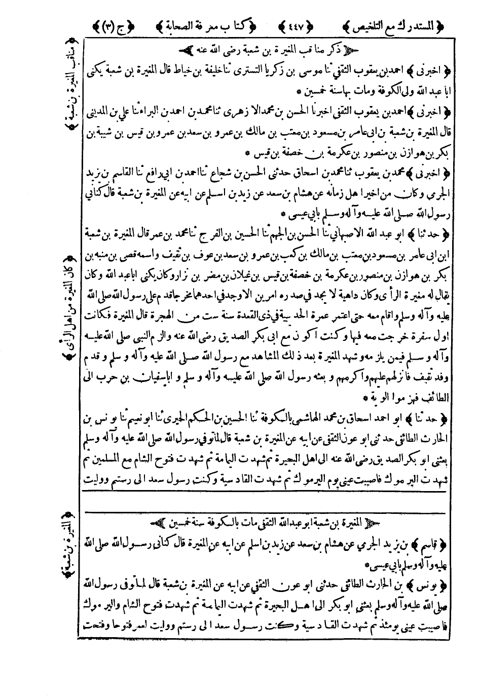 5890- حَدَّثَنَا أَبُو أَحْمَدَ إِسْحَاقُ بْنُ مُحَمَّدٍ الْهَاشِمِيُّ بِالْكُوفَةِ ، حَدَّثَنَا الْحُسَيْنُ بْنُ الْحَكَمِ الْحِيرِيُّ ، حَدَّثَنَا أَبُو نُعَيْمٍ ، حَدَّثَنَا يُونُسُ بْنُ الْحَارِثِ الطَّائِفِيُّ ، حَدَّثَنِي أَبُو عَوْنٍ الثَّقَفِيُّ ، عَنْ أَبِيهِ ، عَنِ الْمُغِيرَةِ بْنِ شُعْبَةَ ، قَالَ : لَمَّا تُوُفِيَ رَسُولُ اللهِ صَلَّى اللَّهُ عَلَيْهِ وَسَلَّمَ بَعَثَنِي أَبُو بَكْرٍ الصِّدِّيقُ رَضِيَ اللَّهُ عَنْهُ إِلَى أَهْلِ الْبُحَيْرَةِ ، ثُمَّ شَهِدْتُ الْيَمَامَةَ ثُمَّ شَهِدْتُ فُتُوحَ الشَّامِ مَعَ الْمُسْلِمِينَ ، ثُمَّ شَهِدْتُ الْيَرْمُوكَ فَأُصِيبَتْ عَيْنِي يَوْمَ الْيَرْمُوكِ ثُمَّ شَهِدْتُ الْقَادِسِيَّةَ وَكُنْتُ رَسُولَ سَعْدٍ إِلَى رُسْتُمَ وَوُلِّيتُ لِعُمَرَ بْنِ الْخَطَّابِ فُتُوحًا ، وَفَتَحْتُ هَمَذَانَ ، وَكُنْتُ عَلَى مَيْسَرَةِ النُّعْمَانِ بْنِ مُقَرِّنٍ يَوْمَ نَهَاوَنْدَ ، وَكَانَ عُمَرُ قَدْ كَتَبَ : إِنْ هَلَكَ النُّعْمَانُ ، فَالأَمِيرُ حُذَيْفَةُ ، وَإِنْ هَلَكَ حُذَيْفَةُ فَالأَمِيرُ الْمُغِيرَةُ ، وَكُنْتُ أَوَّلَ مَنْ وَضَعَ دِيوَانَ الْبَصْرَةِ ، وَجَمَعْتُ النَّاسَ لِيُعْطَوْا ، وَوُلِّيتُ الْكُوفَةَ لِعُمَرَ بْنِ الْخَطَّابِ ، وَقُتِلَ عُمَرُ ، وَأَنَا عَلَيْهَا ، ثُمَّ وُلِّيتُهَا لِمُعَاوِيَةَ.