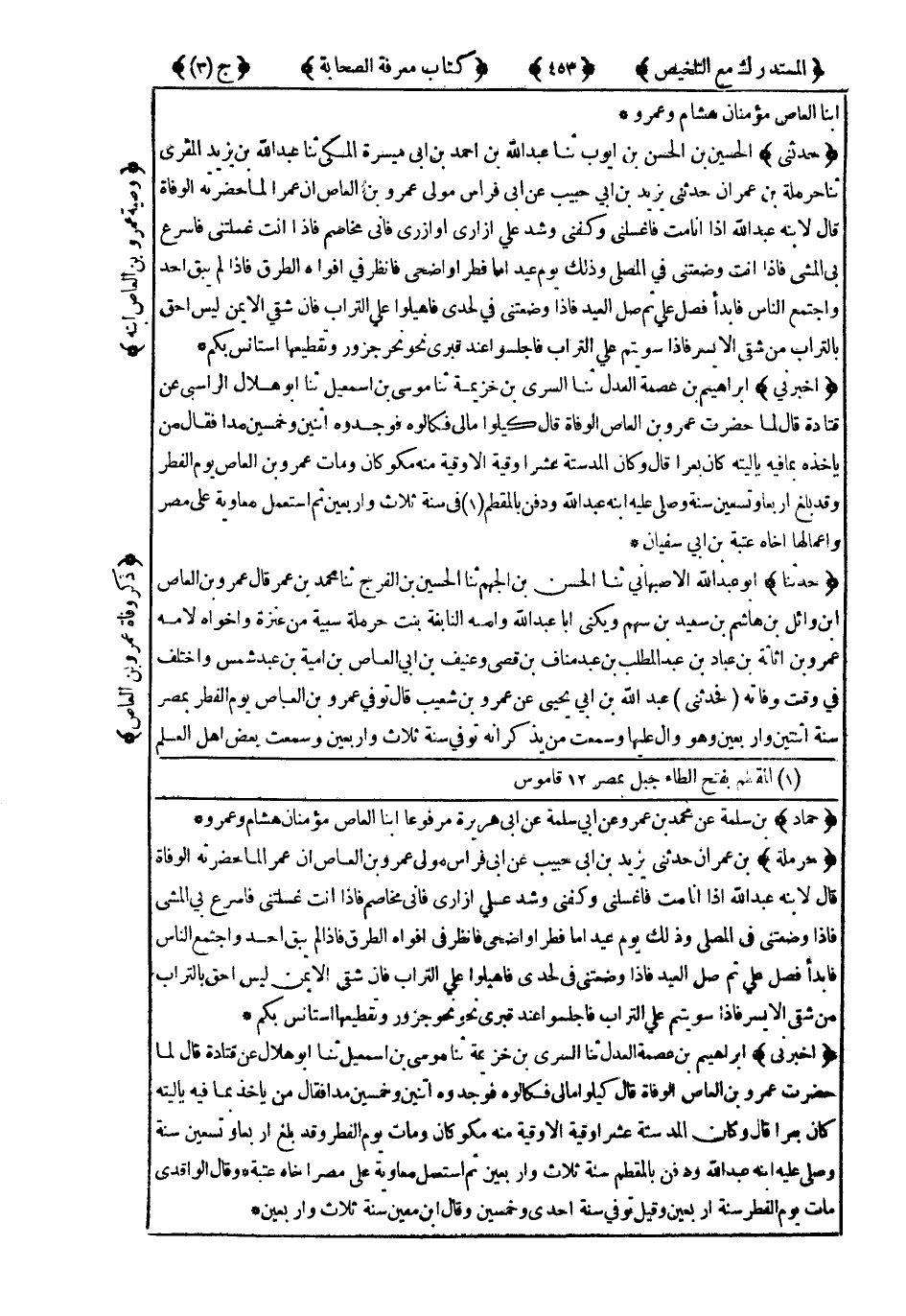 5906- حَدَّثَنِي الْحُسَيْنُ بْنُ الْحَسَنِ بْنِ أَيُّوبَ ، حَدَّثَنَا عَبْدُ اللهِ بْنُ أَحْمَدَ بْنِ أَبِي مَسَرَّةَ الْمَكِّيُّ ، حَدَّثَنَا عَبْدُ اللهِ بْنُ يَزِيدَ الْمُقْرِئُ ، حَدَّثَنَا حَرْمَلَةُ بْنُ عِمْرَانَ ، حَدَّثَنِي يَزِيدُ بْنُ أَبِي حَبِيبٍ ، عَنْ أَبِي فِرَاسٍ مَوْلَى عَمْرِو بْنِ الْعَاصِ ، أَنَّ عَمْرًا ، لَمَّا حَضَرَتْهُ الْوَفَاةُ ، قَالَ لِابْنِهِ عَبْدِ اللهِ : إِذَا أَنَا مُتُّ فَاغْسِلْنِي وَكَفِّنِّي وَشُدَّ عَلَيَّ إِزَارِي - أَوْ أَزْرِي - فَإِنِّي مُخَاصِمٌ ، فَإِذَا أَنْتَ غَسَّلْتَنِي فَأَسْرِعْ بِي الْمَشْيَ ، فَإِذَا أَنْتَ وَضَعْتَنِي فِي الْمُصَلَّى ، وَذَلِكَ يَوْمَ عِيدٍ إِمَّا فِطْرٍ أَوْ أَضْحًى فَانْظُرْ فِي أَفْوَاهِ الطُّرُقِ ، فَإِذَا لَمْ يَبْقَ أَحَدٌ ، وَاجْتَمَعَ النَّاسُ فَابْدَأْ فَصَلِّ عَلَيَّ ، ثُمَّ صَلِّ الْعِيدَ ، فَإِذَا وَضَعْتَنِي فِي لَحْدِي فَأَهِيلُوا عَلَيَّ التُّرَابَ ، فَإِنَّ شِقِّيَ الأَيْمَنَ لَيْسَ أَحَقَّ بِالتُّرَابِ مِنْ شِقِّي الأَيْسَرِ ، فَإِذَا سَوَّيْتُمْ عَلَيَّ التُّرَابَ ، فَاجْلِسُوا عِنْدَ قَبْرِي نَحْوَ نَحْرِ جَزُورٍ وَتَقْطِيعِهَا أَسْتَأْنِسُ بِكُمْ.