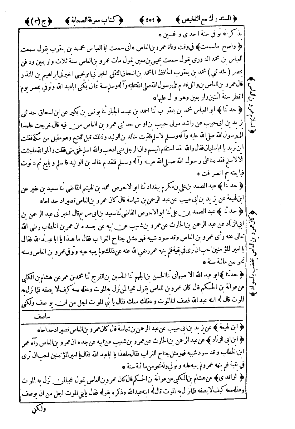 5910- إِنِّي سَمِعْتُ أَبَا الْعَبَّاسِ مُحَمَّدَ بْنَ يَعْقُوبَ ، يَقُولُ : سَمِعْتُ الْعَبَّاسَ بْنَ مُحَمَّدٍ الدُّورِيَّ ، يَقُولُ : سَمِعْتُ يَحْيَى بْنَ مَعِينٍ ، يَقُولُ : مَاتَ عَمْرُو بْنُ الْعَاصِ سَنَةَ ثَلاَثٍ وَأَرْبَعِينَ ، وَدُفِنَ بِمِصْرَ.
