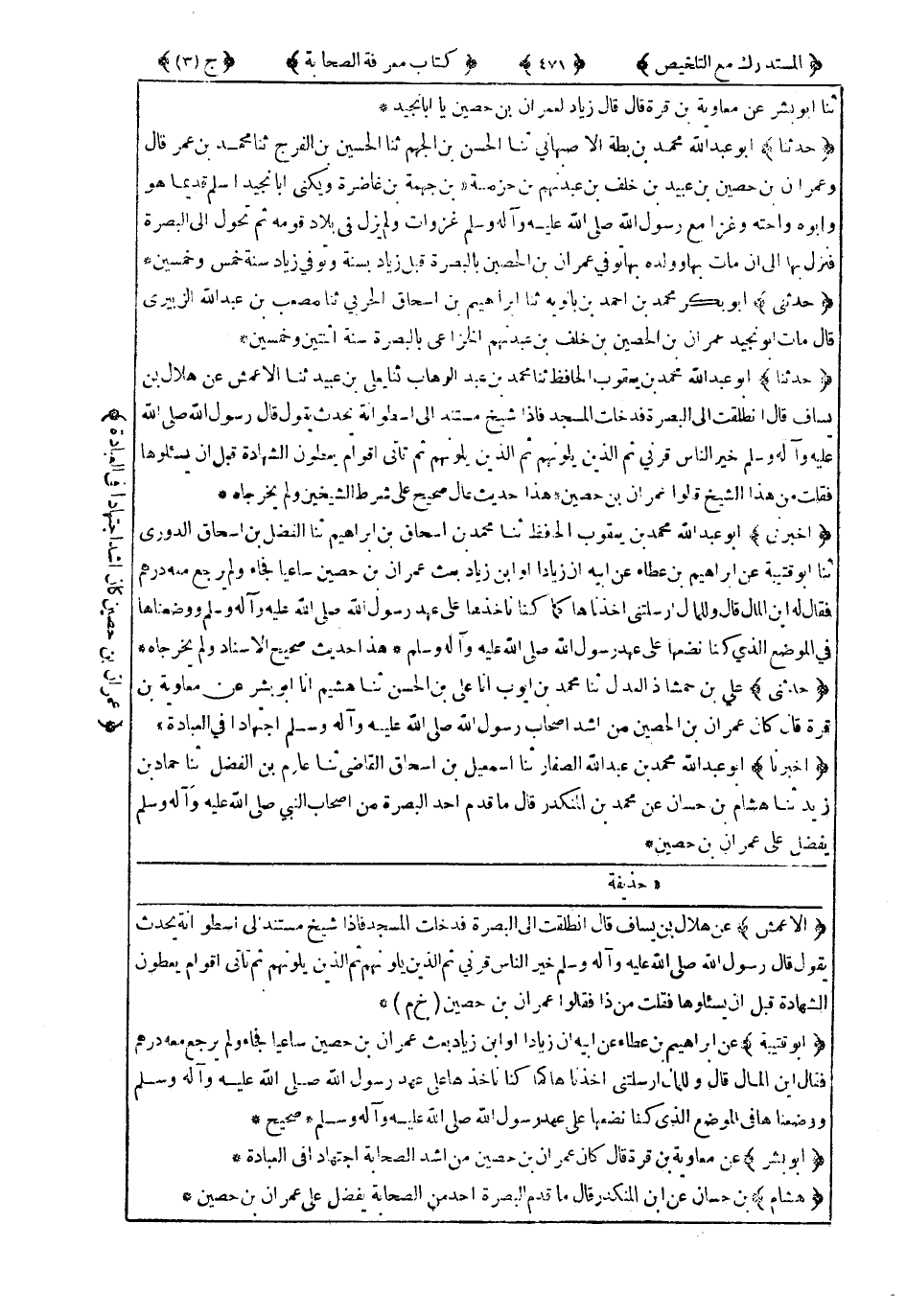 5986- حَدَّثَنَا أَبُو عَبْدِ اللهِ مُحَمَّدُ بْنُ بَطَّةَ الأَصْبَهَانِيُّ ، حَدَّثَنَا الْحَسَنُ بْنُ الْجَهْمِ ، حَدَّثَنَا الْحُسَيْنُ بْنُ الْفَرَجِ ، حَدَّثَنَا مُحَمَّدُ بْنُ عُمَرَ ، قَالَ : وَعِمْرَانُ بْنُ حُصَيْنِ بْنِ عُبَيْدِ بْنِ خَلَفِ بْنِ عَبْدِ نَهِمِ بْنِ حُزْمَةَ بْنِ جَهْمَةَ بْنِ غَاضِرَةَ وَيُكَنَّى أَبَا نُجَيْدٍ ، أَسْلَمَ قَدِيمًا هُوَ وَأَبُوهُ وَأُخْتُهُ ، وَغَزَا مَعَ رَسُولِ اللهِ صَلَّى اللَّهُ عَلَيْهِ وَسَلَّمَ غَزَوَاتٍ ، وَلَمْ يَزَلْ فِي بِلاَدِ قَوْمِهِ ، ثُمَّ تَحَوَّلَ إِلَى الْبَصْرَةِ ، فَنَزَلَ بِهَا إِلَى أَنْ مَاتَ بِهَا ، وَوَلَدُهُ بِهَا ، وَتُوُفِّيَ عِمْرَانُ بْنُ الْحُصَيْنِ بِالْبَصْرَةِ قَبْلَ زِيَادٍ بِسَنَةٍ ، وَتُوُفِّيَ زِيَادٌ سَنَةَ خَمْسٍ وَخَمْسِينَ.