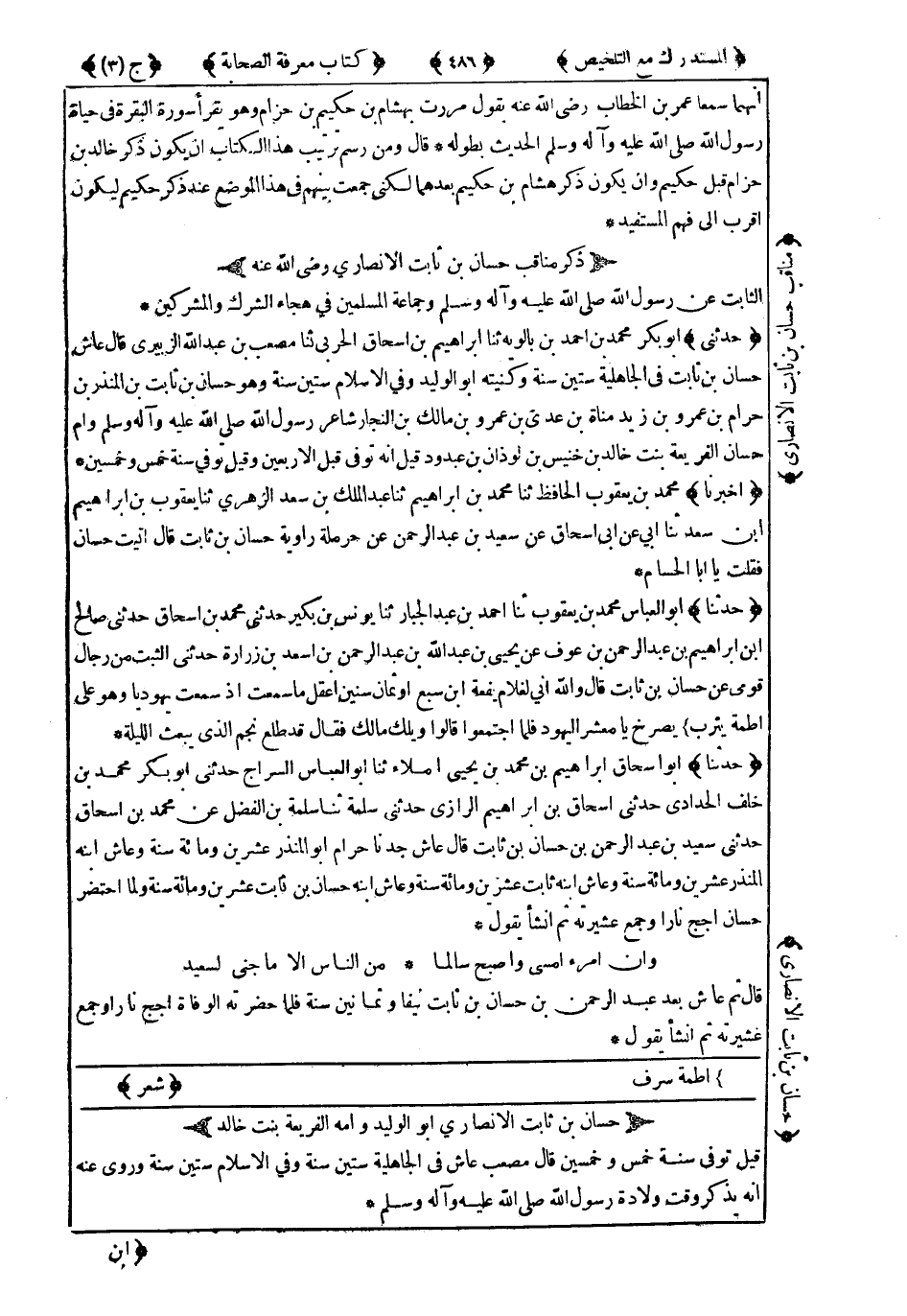 6054- حَدَّثَنِي أَبُو بَكْرٍ مُحَمَّدُ بْنُ أَحْمَدَ بْنِ بَالَوَيْهِ ، حَدَّثَنَا إِبْرَاهِيمُ بْنُ إِسْحَاقَ الْحَرْبِيُّ ، حَدَّثَنَا مُصْعَبُ بْنُ عَبْدِ اللهِ الزُّبَيْرِيُّ ، قَالَ : عَاشَ حَسَّانُ بْنُ ثَابِتٍ فِي الْجَاهِلِيَّةِ سِتِّينَ سَنَةً ، وَكُنْيَتُهُ أَبُو الْوَلِيدِ وَفِي الإِسْلاَمِ سِتِّينَ سَنَةً ، وَهُوَ حَسَّانُ بْنُ ثَابِتِ بْنِ الْمُنْذِرِ بْنِ حَرَامِ بْنِ عَمْرِو بْنِ زَيْدِ مَنَاةَ بْنِ عَدِيِّ بْنِ عَمْرِو بْنِ مَالِكِ بْنِ النَّجَّارِ شَاعِرُ رَسُولِ اللهِ صَلَّى اللَّهُ عَلَيْهِ وَسَلَّمَ ، وَأُمُّ حَسَّانَ الْفُرَيْعَةُ بِنْتُ خَالِدِ بْنِ خُنَيْسِ بْنِ لَوْذَانَ بْنِ عَبْدِ وَدٍّ قِيلَ إِنَّهُ تُوُفِّيَ قَبْلَ الأَرْبَعِينَ ، وَقِيلَ تُوُفِّيَ سَنَةَ خَمْسٍ وَخَمْسِينَ.