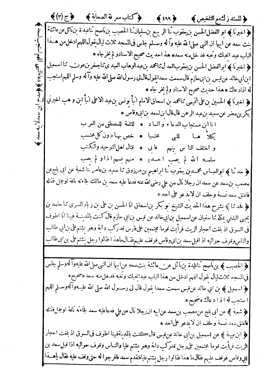 6119- أَخْبَرَنَا الْحُسَيْنُ بْنُ عَلِيٍّ التَّمِيمِيُّ ، حَدَّثَنَا مُحَمَّدُ بْنُ إِسْحَاقَ الإِمَامُ ، أَنْبَأَ يُونُسُ بْنُ عَبْدِ الأَعْلَى ، أَنْبَأَ ابْنُ وَهْبٍ ، أَخْبَرَنِي بَكْرُ بْنُ مُضَرَ ، عَنْ سَعِيدِ بْنِ عَبْدِ الرَّحْمَنِ ، قَالَ : قَالَ سَعْدُ بْنُ أَبِي وَقَّاصٍ: