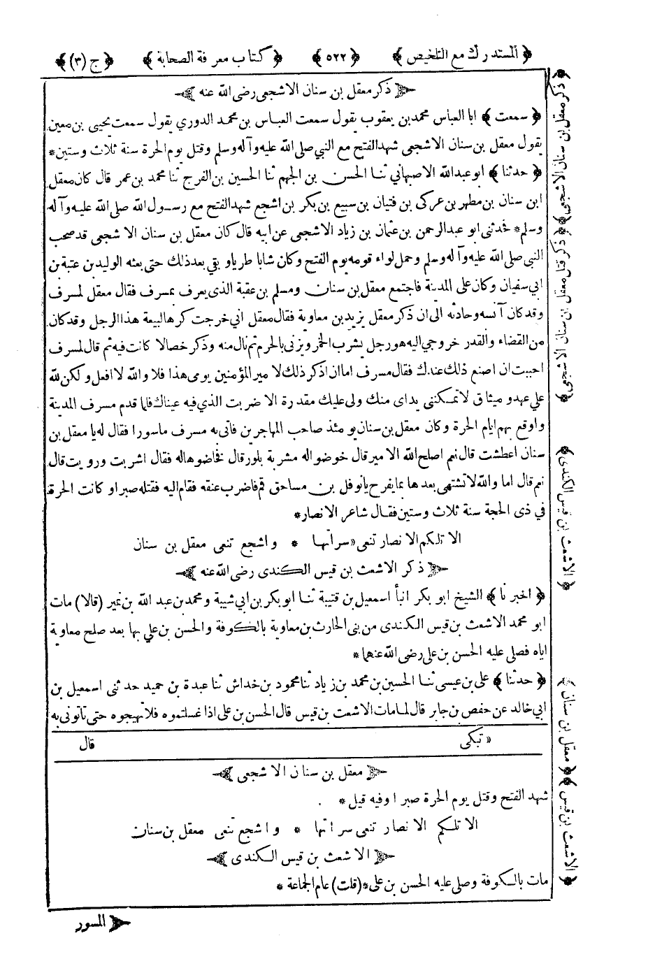 أَلاَ تِلْكُمُ الأَنْصَارُ تَنْعِي سُرَاتَهَا ..... وَأَشْجَعُ تَنْعِي مَعْقِلَ بْنَ سِنَانِ