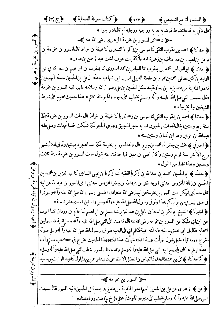هَذَا حَدِيثٌ صَحِيحٌ عَلَى شَرْطِ الشَّيْخَيْنِ ، وَلَمْ يُخَرِّجَاهُ قَدْ صَحَّ وَثَبَتَ بِمَا ذَكَرْتُهُ سَمَاعَ الْمِسْوَرِ بْنِ مَخْرَمَةَ مِنْ رَسُولِ اللهِ صَلَّى اللَّهُ عَلَيْهِ وَسَلَّمَ لاَ كَمَا يَتَوَهَّمَهُ رَعَاعُ أَصْحَابِنَا أَنَّهُ مِمَّنْ لَهُ رِوَايَةٌ بِلاَ سَمَاعٍ.