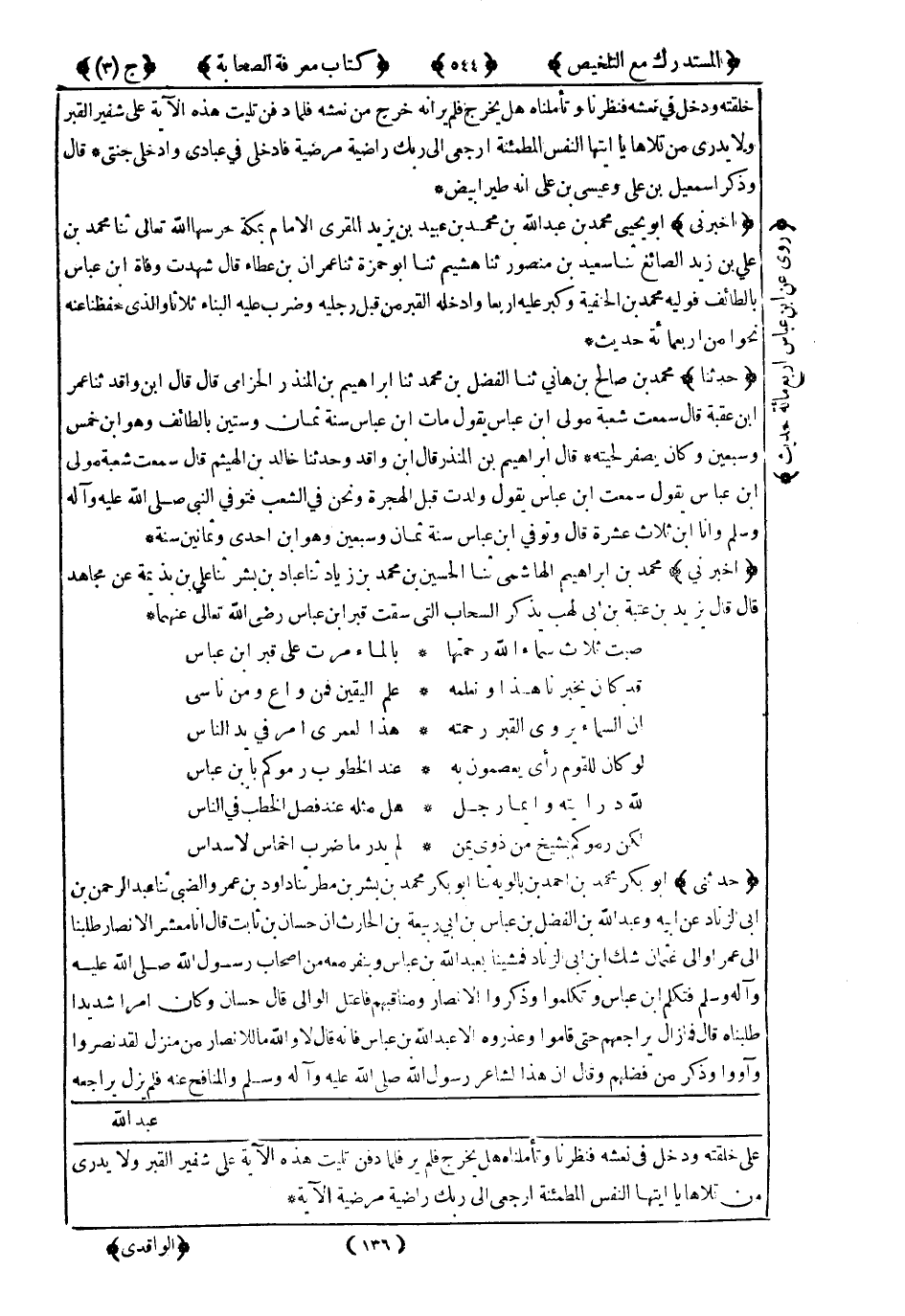 صَبَّتْ ثَلاَثًا سَمَاءُ اللهِ رَحْمَتَهَا ..... بِالْمَاءِ مَرَّتْ عَلَى قَبْرِ ابْنِ عَبَّاسٍ
