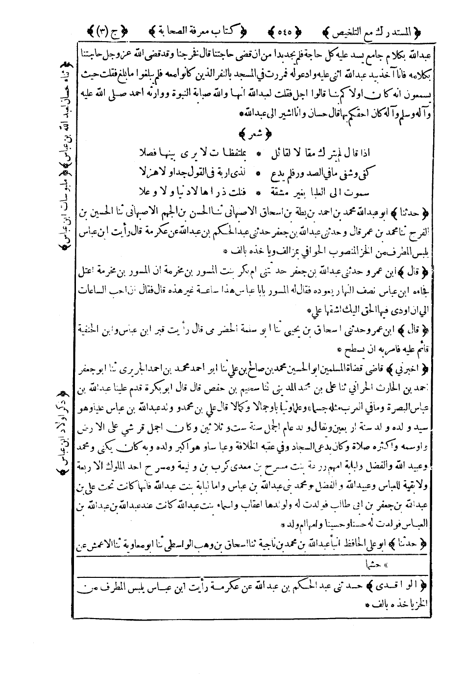 6318- أَخْبَرَنِي قَاضِي قُضَاةِ الْمُسْلِمِينَ أَبُو الْحُسَيْنِ مُحَمَّدُ بْنُ صَالِحِ بْنِ عَلِيٍّ ، حَدَّثَنَا أَبُو أَحْمَدَ مُحَمَّدُ بْنُ أَحْمَدَ الْجُرَيْرِيُّ ، حَدَّثَنَا أَبُو جَعْفَرٍ أَحْمَدُ بْنُ الْحَارِثِ الْحَرَّانِيُّ ، حَدَّثَنَا عَلِيُّ بْنُ مُحَمَّدٍ الْمَدِينِيُّ ، حَدَّثَنَا سُحَيْمُ بْنُ حَفْصٍ ، قَالَ : قَالَ أَبُو بَكْرَةَ : قَدِمَ عَلَيْنَا عَبْدُ اللهِ بْنُ عَبَّاسٍ الْبَصْرَةَ وَمَا فِي الْعَرَبِ مِثْلُهُ جِسْمًا وَعِلْمًا وَثِيَابًا وَجَمَالاً وَكَمَالاً قَالَ عَلِيُّ بْنُ مُحَمَّدٍ : وَوَلَدُ عَبْدِ اللهِ بْنِ عَبَّاسٍ عَلِيًّا وَهُوَ سَيِّدُ وَلَدِهِ ، وُلِدَ سَنَةَ أَرْبَعِينَ ، وَيُقَالُ وُلِدَ عَامَ الْجَمَلِ سَنَةَ سِتٍّ وَثَلاَثِينَ ، وَكَانَ أَجْمَلَ قُرَشِيٍّ عَلَى الأَرْضِ وَأَوْسَمَهُ ، وَأَكْثَرَهُ صَلاَةً ، وَكَانَ يُدْعَى السَّجَّادُ ، وَفِي عَقِبِهِ الْخِلاَفَةُ ، وَعَبَّاسًا ، وَهُوَ أَكْبَرُ وَلَدِهِ ، وَبِهِ كَانَ يُكَنَّى ، وَمُحَمَّدٌ ، وَعُبَيْدُ اللهِ ، وَالْفَضْلُ ، وَلُبَابَةُ أُمُّهُمْ زُرْعَةُ بِنْتُ مُسَرِّحِ بْنِ مَعْدِي كَرِبَ بْنِ وَلِيعَةَ ، وَمُسَرِّحٌ أَحَدُ الْمُلُوكِ الأَرْبَعَةِ ، وَلاَ بَقِيَّةَ لِلْعَبَّاسِ ، وَعُبَيْدُ اللهِ ، وَالْفَضْلُ ، وَمُحَمَّدٌ بَنِي عَبْدِ اللهِ بْنِ عَبَّاسٍ ، وَأَمَّا لُبَابَةُ بِنْتُ عَبْدِ اللهِ فَإِنَّهَا كَانَتْ تَحْتَ عَلِيِّ بْنِ عَبْدِ اللهِ بْنِ جَعْفَرِ بْنِ أَبِي طَالِبٍ فَوَلَدَتْ لَهُ وَلِوَلَدِهَا أَعْقَابٌ ، وَأَسْمَاءُ بِنْتُ عَبْدِ اللهِ كَانَتْ عِنْدَ عَبْدِ اللهِ بْنِ عَبْدِ اللهِ بْنِ الْعَبَّاسِ ، فَوَلَدَتْ لَهُ حَسَنًا ، وَحُسَيْنًا ، وَأُمُّهَا أُمُّ وَلَدٍ.