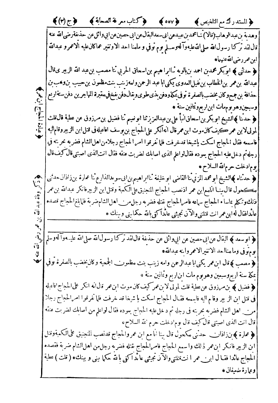 6355- حَدَّثَنِي أَبُو بَكْرٍ مُحَمَّدُ بْنُ أَحْمَدَ بْنِ بَالَوَيْهِ ، حَدَّثَنَا إِبْرَاهِيمُ بْنُ إِسْحَاقَ الْحَرْبِيُّ ، حَدَّثَنَا مُصْعَبُ بْنُ عَبْدِ اللهِ الزُّبَيْرِيُّ قَالَ : عَبْدُ اللهِ بْنُ عُمَرَ بْنِ الْخَطَّابِ بْنِ نُفَيْلٍ الْعَدَوِيُّ يُكَنَّى أَبَا عَبْدِ الرَّحْمَنِ ، وَأُمُّهُ زَيْنَبُ بِنْتُ مَظْعُونِ بْنِ حَبِيبِ بْنِ وَهْبِ بْنِ حُذَافَةَ بْنِ جُمَحٍ وَكَانَ يَخْضِبُ بِالصُّفْرَةِ ، تُوُفِّيَ بِمَكَّةَ وَدُفِنَ بِذِي طُوًى ، وَيُقَالُ دُفِنَ بِفَخٍّ فِي مَقْبَرَةِ الْمُهَاجِرِينَ ، دُفِنَ سَنَةَ أَرْبَعٍ وَسَبْعِينَ وَهُوَ يَوْمَ مَاتَ ابْنُ أَرْبَعٍ وَثَمَانِينَ سَنَةً.