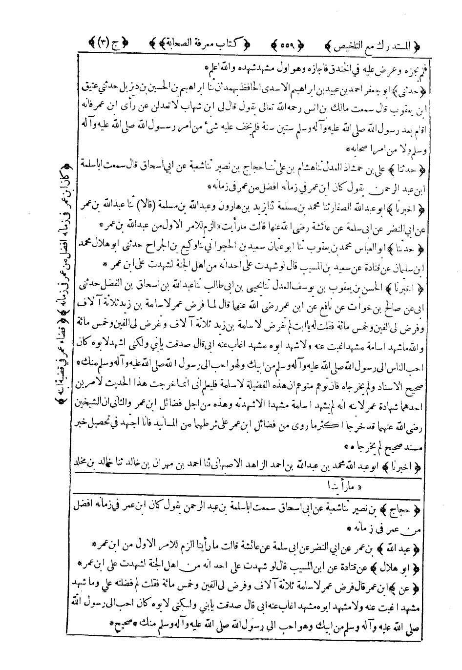 صَحِيحُ الإِسْنَادِ ، وَلَمْ يُخَرِّجَاهُ ، فَإِنْ تَوَهَّمَ مُتَوَهِّمٌ أَنَّ هَذِهِ الْفَضِيلَةَ لأُسَامَةَ فَلْيَعْلَمْ أَنِّي إِنَّمَا خَرَّجْتُ هَذَا الْحَدِيثَ لأَمْرَيْنِ : أَحَدُهُمَا شَهَادَةُ عُمَرَ لِابْنِهِ أَنَّهُ لَمْ يَشْهَدْ أُسَامَةُ مَشْهَدًا إِلاَّ شَهِدْتُهُ ، وَهَذِهِ مِنْ أَجْلِ فَضَائِلِ ابْنِ عُمَرَ ، وَالثَّانِي أَنَّ الشَّيْخَيْنِ رَضِيَ اللَّهُ عَنْهُمَا قَدْ خَرَّجَا أَكْثَرَ مَا رُوِيَ مِنْ فَضَائِلِ ابْنِ عُمَرَ عَلَى شَرْطِهِمَا مِنَ الْمَسَانِيدِ ، فَأَنَا أَجْتَهِدُ فِي تَحْصِيلِ خَبَرِ مُسْنَدٍ صَحِيحٍ لَمْ يُخَرِّجَاهُ.