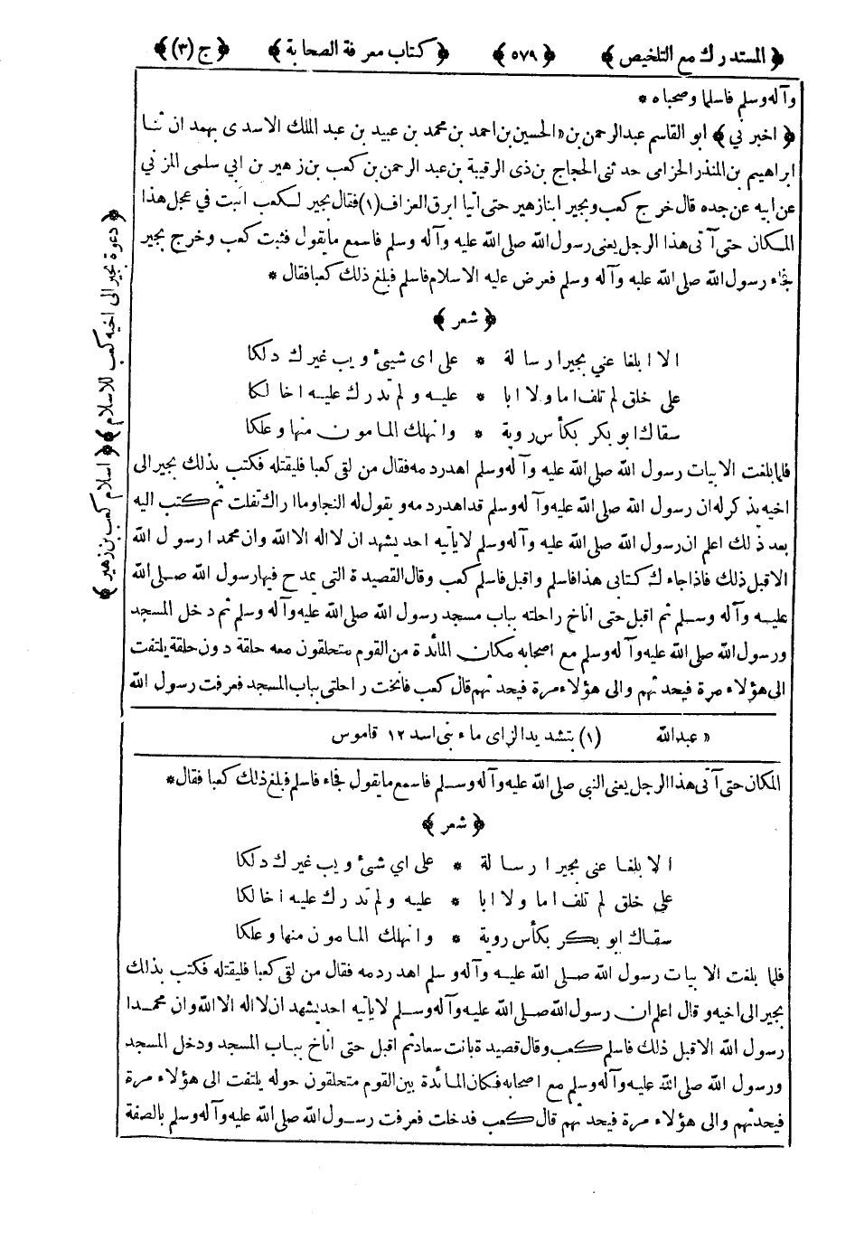 فَلَمَّا بَلَغَتِ الأَبْيَاتُ رَسُولَ اللهِ صَلَّى اللَّهُ عَلَيْهِ وَسَلَّمَ أَهْدَرَ دَمَهُ ، فَقَالَ : مَنْ لَقِيَ كَعْبًا فَلْيَقْتُلْهُ فَكَتَبَ بِذَلِكَ بُجَيْرٌ إِلَى أَخِيهِ يَذْكُرُ لَهُ أَنَّ رَسُولَ اللهِ صَلَّى اللَّهُ عَلَيْهِ وَسَلَّمَ قَدْ أَهْدَرَ دَمَهُ وَيَقُولُ لَهُ : النَّجَا وَمَا أَرَاكَ تَفْلِتُ ، ثُمَّ كَتَبَ إِلَيْهِ بَعْدَ ذَلِكَ اعْلَمْ أَنَّ رَسُولَ اللهِ صَلَّى اللَّهُ عَلَيْهِ وَسَلَّمَ لاَ يَأْتِيَهُ أَحَدٌ يَشْهَدُ أَنَّ لاَ إِلَهَ إِلاَّ اللَّهُ ، وَأَنَّ مُحَمَّدًا رَسُولُ اللهِ إِلاَّ قَبِلَ ذَلِكَ ، فَإِذَا جَاءَكَ كِتَابِي هَذَا فَأَسْلِمْ وَأَقْبِلْ فَأَسْلَمَ كَعْبٌ وَقَالَ الْقَصِيدَةَ الَّتِي يَمْدَحُ فِيهَا رَسُولَ اللهِ صَلَّى اللَّهُ عَلَيْهِ وَسَلَّمَ ، ثُمَّ أَقْبَلَ حَتَّى أَنَاخَ رَاحِلَتَهُ بِبَابِ مَسْجِدِ رَسُولِ اللهِ صَلَّى اللَّهُ عَلَيْهِ وَسَلَّمَ ، ثُمَّ دَخَلَ الْمَسْجِدَ وَرَسُولُ اللهِ صَلَّى اللَّهُ عَلَيْهِ وَسَلَّمَ مَعَ أَصْحَابِهِ مَكَانَ الْمَائِدَةِ مِنَ الْقَوْمِ مُتَحَلِّقُونَ مَعَهُ حَلْقَةً دُونَ حَلْقَةٍ يَلْتَفِتُ إِلَى هَؤُلاَءِ مَرَّةً ، فَيُحَدِّثُهُمْ وَإِلَى هَؤُلاَءِ مَرَّةً ، فَيُحَدِّثُهُمْ ، قَالَ كَعْبٌ فَأَنَخْتُ رَاحِلَتِي بِبَابِ الْمَسْجِدِ ، فَعَرَفْتُ رَسُولَ اللهِ صَلَّى اللَّهُ عَلَيْهِ وَسَلَّمَ بِالصِّفَةِ
