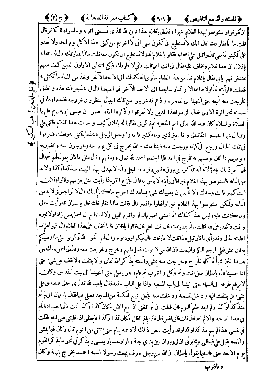 وَاسْتَوْصُوا بِهَذَا الْغُلاَمِ خَيْرًا ، وَقَالَ لِي : يَا غُلاَمُ هَذَا دَيْنُ اللهِ الَّذِي تَسْمَعُنِي أَقُولُهُ وَمَا سِوَاهُ الْكُفْرُ ، قَالَ : قُلْتُ : مَا أَنَا بِمُفَارِقُكَ ، قَالَ : إِنَّكَ لاَ تَسْتَطِيعُ أَنْ تَكُونَ مَعِي إِنِّي لاَ أَخْرَجُ مِنْ كَهْفِي هَذَا إِلاَّ كُلَّ يَوْمِ أَحَدٍ ، وَلاَ تَقْدِرُ عَلَى الْكَيْنُونَةِ مَعِي ، قَالَ : وَأَقْبَلَ عَلى أَصْحَابِهِ ، فَقَالُوا : يَا غُلاَمُ ، إِنَّكَ لاَ تَسْتَطِيعُ أَنْ تَكُونَ مَعَهُ ، قُلْتُ : مَا أَنَا بِمُفَارِقُكَ ، قَالَ لَهُ أَصْحَابُهُ : يَا فُلاَنُ ، إِنَّ هَذَا غُلاَمٌ وَيُخَافُ عَلَيْهِ ، فَقَالَ لِي : أَنْتَ أَعْلَمُ ، قُلْتُ : فَإِنِّي لاَ أُفَارِقُكَ ، فَبَكَى أَصْحَابِي الأَوَّلُونَ الَّذِينَ كُنْتُ مَعَهُمْ عِنْدَ فُرَاقِهِمْ إِيَّايَ ، فَقَالَ : يَا غُلاَمُ ، خُذْ مِنْ هَذَا الطَّعَامِ مَا تَرَى أَنَّهُ يَكْفِيكَ إِلَى الأَحَدِ الآخَرِ ، وَخُذْ مِنَ الْمَاءِ مَا تَكْتَفِي بِهِ ، فَفَعَلْتُ فَمَا رَأَيْتُهُ نَائِمًا وَلاَ طَاعِمًا إِلاَّ رَاكِعًا وَسَاجِدًا إِلَى الأَحَدِ الآخَرِ ، فَلَمَّا أَصْبَحْنَا ، قَالَ لِي : خُذْ جَرَّتَكَ هَذِهِ وَانْطَلِقْ فَخَرَجْتُ مَعَهُ أَتْبَعُهُ حَتَّى انْتَهَيْنَا إِلَى الصَّخْرَةِ ، وَإِذَا هُمْ قَدْ خَرَجُوا مِنْ تِلْكَ الْجِبَالِ يَنْتَظِرُونَ خُرُوجَهُ فَقَعَدُوا وَعَادَ فِي حَدِيثِهِ نَحْوَ الْمَرَّةِ الآولَى ، فَقَالَ : الْزَمُوا هَذَا الدِّينَ وَلاَ تَفَرَّقُوا ، وَاذْكُرُوا اللَّهَ وَاعْلَمُوا أَنَّ عِيسَى ابْنَ مَرْيَمَ عَلَيْهِمَا الصَّلاَةُ وَالسَّلاَمُ كَانَ عَبْدَ اللهِ تَعَالَى أَنْعَمَ اللَّهُ عَلَيْهِ ، ثُمَّ ذَكَرَنِي ، فَقَالُوا لَهُ : يَا فُلاَنُ كَيْفَ وَجَدْتَ هَذَا الْغُلاَمَ ؟ فَأَثْنَى عَلَيَّ ، وَقَالَ خَيْرًا : فَحَمِدُوا اللَّهَ تَعَالَى ، وَإِذَا خُبْزٌ كَثِيرٌ ، وَمَاءٌ كَثِيرٌ فَأَخَذُوا وَجَعَلَ الرَّجُلُ يَأْخُذُ مَا يَكْتَفِي بِهِ ، وَفَعَلْتُ فَتَفَرَّقُوا فِي تِلْكَ الْجِبَالِ وَرَجَعَ إِلَى كَهْفِهِ وَرَجَعْتُ مَعَهُ فَلَبِثْنَا مَا شَاءَ اللَّهُ يَخْرُجُ فِي كُلِّ يَوْمٍ أَحَدٍ ، وَيَخْرُجُونَ مَعَهُ وَيَحُفُّونَ بِهِ وَيُوصِيهِمْ بِمَا كَانَ يُوصِيهِمْ بِهِ فَخَرَجَ فِي أَحَدٍ ، فَلَمَّا اجْتَمَعُوا حَمِدَ اللَّهَ تَعَالَى وَوَعِظَهُمْ وَقَالَ : مِثْلَ مَا كَانَ يَقُولُ لَهُمْ ، ثُمَّ قَالَ لَهُمْ آخِرَ ذَلِكَ : يَا هَؤُلاَءِ إِنَّهُ قَدْ كَبِرَ سِنِّي ، وَرَقَّ عَظْمِي ، وَقَرُبَ أَجَلِي ، وَأَنَّهُ لاَ عَهْدَ لِي بِهَذَا الْبَيْتِ مُنْذُ كَذَا وَكَذَا ، وَلاَ بُدَّ مِنْ إِتْيَانِهِ فَاسْتَوْصُوا بِهَذَا الْغُلاَمِ خَيْرًا ، فَإِنِّي رَأَيْتُهُ لاَ بَأْسَ بِهِ ، قَالَ : فَجَزِعَ الْقَوْمُ فَمَا رَأَيْتُ مِثْلَ جَزَعِهِمْ ، وَقَالُوا : يَا فُلاَنُ ، أَنْتَ كَبِيرٌ فَأَنْتَ وَحْدَكَ ، وَلاَ نَأْمَنُ مِنْ أَنْ يُصِيبَكَ شَيْءٌ يُسَاعِدُكَ أَحْوَجُ مَا كُنَّا إِلَيْكَ ، قَالَ : لاَ تُرَاجِعُونِي ، لاَ بُدَّ مِنَ اتِّبَاعِهِ ، وَلَكِنِ اسْتَوْصُوا بِهَذَا الْغُلاَمِ خَيْرًا وَافْعَلُوا وَافْعَلُوا ، قَالَ : فَقُلْتُ : مَا أَنَا بِمُفَارِقُكَ ، قَالَ : يَا سَلْمَانُ قَدْ رَأَيْتَ حَالِي وَمَا كُنْتُ عَلَيْهِ وَلَيْسَ هَذَا كَذَلِكَ أَنَا أَمْشِي أَصُومُ النَّهَارَ وَأَقُومُ اللَّيْلَ ، وَلاَ أَسْتَطِيعُ أَنْ أَحْمِلَ مَعِي زَادًا وَلاَ غَيْرَهُ وَأَنْتَ لاَ تَقْدِرُ عَلَى هَذَا قُلْتُ مَا أَنَا بِمُفَارِقُكَ ، قَالَ : أَنْتَ أَعْلَمُ ، قَالَ : فَقَالُوا : يَا فُلاَنُ ، فَإِنَّا نَخَافُ عَلَى هَذَا الْغُلاَمِ ، قَالَ : فَهُوَ أَعْلَمُ قَدْ أَعْلَمْتَهُ الْحَالَ وَقَدْ رَأَى مَا كَانَ قَبْلَ هَذَا قُلْتُ : لاَ أُفَارِقُكَ ، قَالَ : فَبَكَوْا و