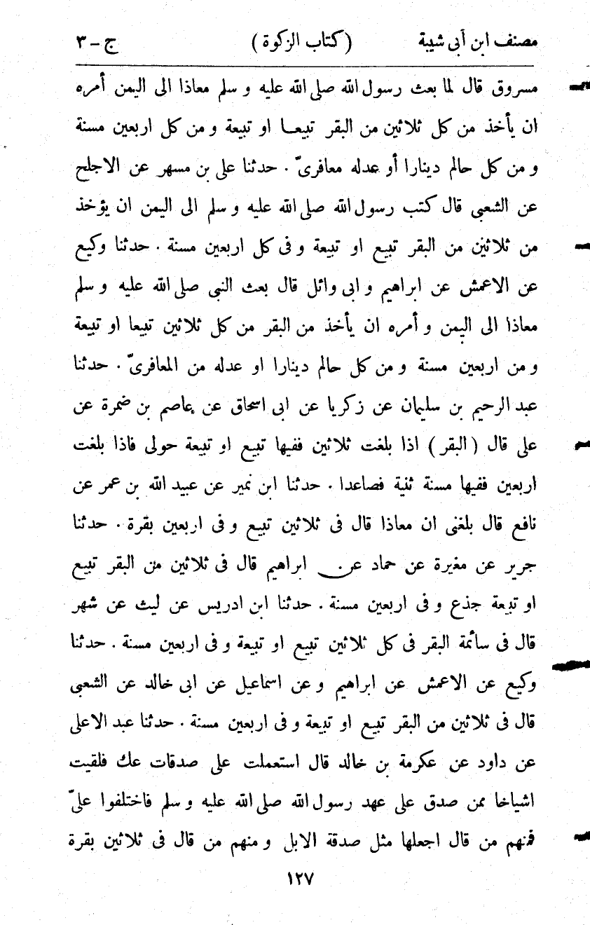 10015- حَدَّثَنَا عَلِيُّ بْنُ مُسْهِرٍ ، عَنِ الأَجْلَحِ ، عَنِ الشَّعْبِيِّ ، قَالَ : كَتَبَ رَسُولُ اللهِ صلى الله عليه وسلم إلَى الْيَمَنِ : أَنْ يُؤْخَذَ مِنْ ثَلاَثِينَ مِنَ الْبَقَرِ تَبِيعٌ ، أَوْ تَبِيعَةٌ ، وَفِي كُلِّ أَرْبَعِينَ مُسِنَّةٌ.