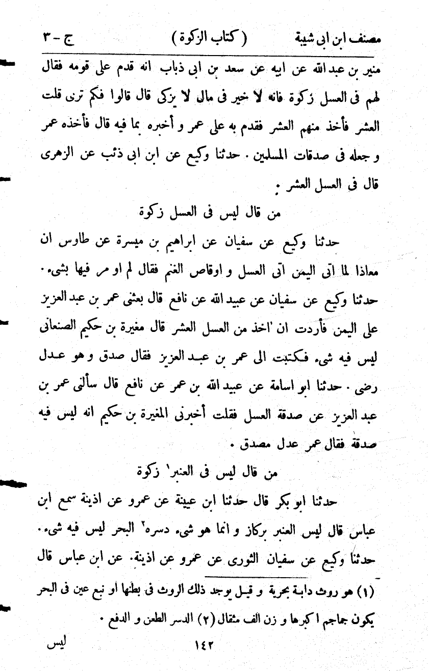 10151- حَدَّثَنَا وَكِيعٌ ، عَنْ سُفْيَانَ ، عَنْ عُبَيْدِ اللهِ ، عَنْ نَافِعٍ ، قَالَ : بَعَثَنِي عُمَرُ بْنُ عَبْدِ الْعَزِيزِ عَلَى الْيَمَنِ ، فَأَرَدْت أَنْ آخُذَ مِنَ الْعَسَلِ الْعُشْرَ ، قَالَ مُغِيرَةُ بْنُ حَكِيمٍ الصَّنْعَانِيُّ : لَيْسَ فِيهِ شَيْءٌ ، فَكَتَبَتُ إلَى عُمَرَ بْنِ عَبْدِ الْعَزِيزِ ، فَقَالَ : صَدَقَ ، وَهُوَ عَدْلٌ رضا.