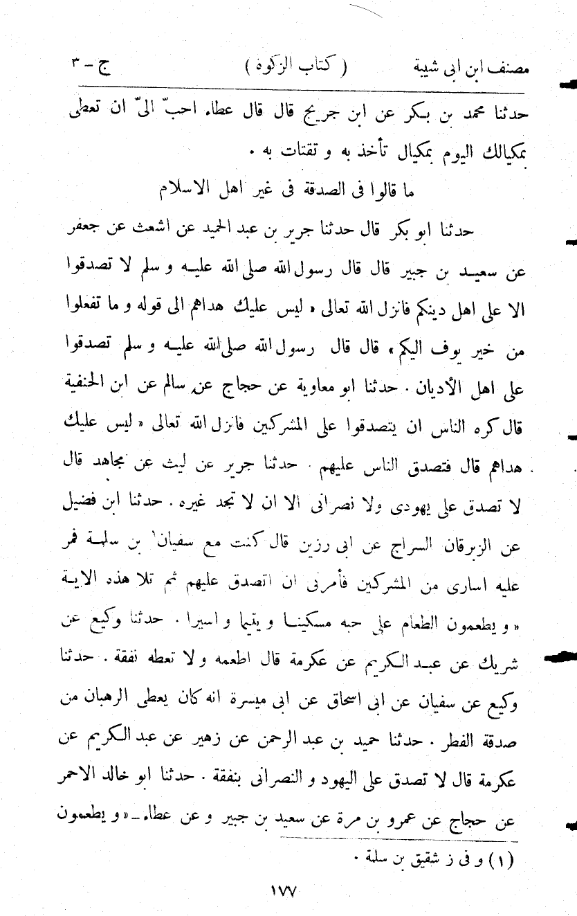 10501- حَدَّثَنَا جَرِيرٌ ، عَنْ لَيْثٍ ، عَنْ مُجَاهِدٍ ، قَالَ : لاَ تَصَدَّقْ عَلَى يَهُودِيٍّ ، وَلاَ نَصْرَانِيٍّ إِلاَّ أَنْ لاَ تَجِدَ غَيْرَهُ.