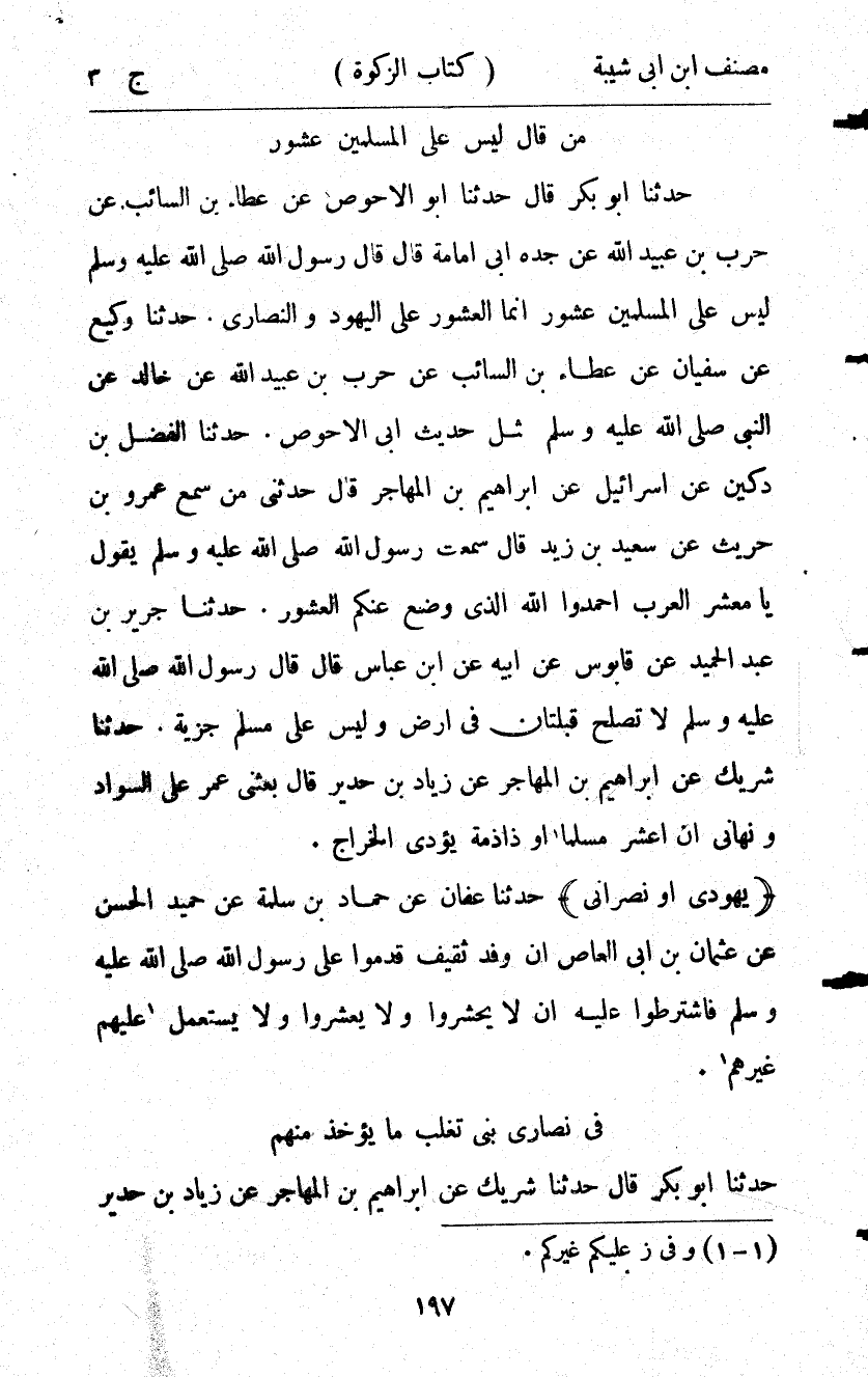 10677- حَدَّثَنَا أَبُو الأَحْوَصِِ ، عَنْ عَطَاءِ بْنِ السَّائِبِ ، عَنْ حَرْبِ بْنِ عُبَيْدِ اللهِ ، عَنْ جَدِّهِ أَبِي أُمهِ ، قَالَ : قَالَ رَسُولُ اللهِ صلى الله عليه وسلم : لَيْسَ عَلَى الْمُسْلِمِينَ عُشُورٌ ، إنَّمَا الْعُشُورُ عَلَى الْيَهُودِ وَالنَّصَارَى.