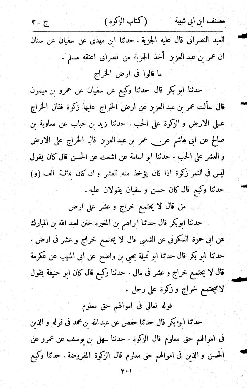 10707- حَدَّثَنَا وَكِيعٌ ، عَنْ سُفْيَانَ ، عَنْ عَمْرِو بْنِ مَيْمُونٍ ، قَالَ : سَأَلْتُ عُمَرَ بْنَ عَبْدِ الْعَزِيزِ عَنْ أَرْضِ الْخَرَاجِ ، عَلَيْهَا زَكَاةٌ ؟ فَقَالَ : الْخَرَاجُ عَلَى الأَرْضِ ، وَالزَّكَاةُ عَلَى الْحَبِّ.