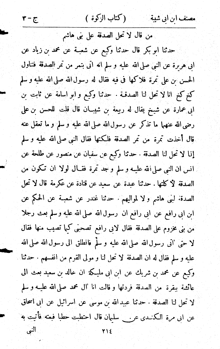 10806- حَدَّثَنَا وَكِيعٌ ، عَنْ شُعْبَةَ ، عَنْ مُحَمَّدِ بْنِ زِيَادٍ ، عَنْ أَبِي هُرَيْرَةَ ، عَنِ النَّبِيِّ صلى الله عليه وسلم ، أُتِيَ بِتَمْرٍ مِنْ تَمْرِ الصَّدَقَةِ فَتَنَاوَلَ الْحَسَنُ بْنُ عَلِيٍّ تَمْرَةً فَلاَكَهَا فِي فِيهِ ، فَقَالَ لَهُ : رَسُولُ اللهِ صلى الله عليه وسلم : كَخٍْ كَخٍْ إنَّا لاَ تَحِلُّ لَنَا الصَّدَقَةُ.