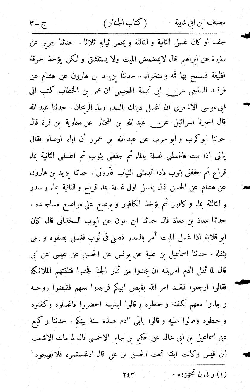 11017- حَدَّثَنَا يَزِيدُ بْنُ هَارُونَ ، عَنْ هِشَامٍ ، عَنْ فَرْقَدٍ السَّبَخِيِّ ، عَنْ أَبِي تَمِيمَةَ الْهُجَيْمِيِّ ، أَنَّ عُمَرَ بْنَ الْخَطَّابِ كَتَبَ إلَى أَبِي مُوسَى الأَشْعَرِيِّ أَنَ اغْسِلْ ذَيْنِكَ بِالسِّدْرِ وَمَاءِ الرَّيْحَانِ.