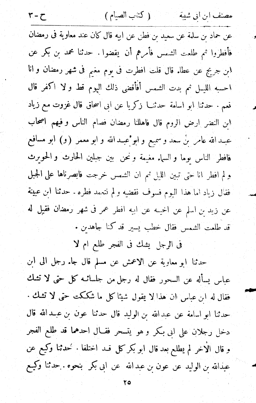 9148- حَدَّثَنَا أَبُو أُسَامَةَ ، حَدَّثَنَا زَكَرِيَّا ، عَنْ أَبِي إِسْحَاقَ ، قَالَ : غَزَوْت مَعَ زِيَادِ بْنِ النَّضْرِ أَرْضَ الرُّومِ ، قَالَ : فَأَهْلَلْنَا رَمَضَانَ فَصَامَ النَّاسُ وَفِيهِمْ أَصْحَابُ عَبْدِ اللهِ ؛ عَامِرِ بْنِ سَعْدٍ ، وَسُمَيْعٌ ، وَأَبُو عَبْدِ اللهِ ، وَأَبُو مَعْمَرٍ ، وَأَبُو مُسَافِعٍ فَأَفْطَرَ النَّاسُ يَوْمًا وَالسَّمَاءُ مُتَغَيِّمَةٌ ، وَنَحْنُ بَيْنَ جَبَلَيْنِ ؛ الْحَارِثِ وَالْحُوَيْرِثِ ، وَلَمْ أُفْطِرْ أَنَا حَتَّى تبدّى اللَّيْل ، ثُمَّ إنَّ الشَّمْسَ خَرَجَتْ فَأَبْصَرْنَاهَا عَلَى الْجَبَلِ ، فَقَالَ زِيَادٌ : أَمَّا هَذَا الْيَوْمُ فَسَوْفَ نَقْضِيهِ ، وَلَمْ نَتَعَمَّدْ فِطْرَهُ.