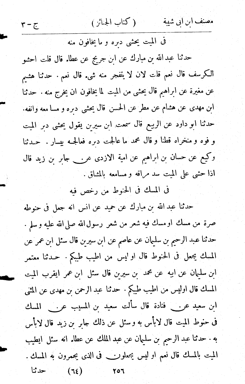 11144- حَدَّثَنَا عَبْدُ الرَّحْمَنِ بْنُ مَهْدِيٍّ ، عَنِ الْمُثَنَّى بْنِ سَعِيدٍ ، عَنْ قَتَادَةَ ، قَالَ : سَأَلْتُ سَعِيدَ بْنَ الْمُسَيَّبِ عَنِ الْمِسْكِ فِي حَنُوطِ الْمَيِّتِ ، قَالَ : لاَ بَأْسَ بِهِ وَسُئِلَ عَنْ ذَلِكَ جَابِرُ بْنُ زَيْدٍ ، قَالَ : لاَ بَأْسَ بِهِ.