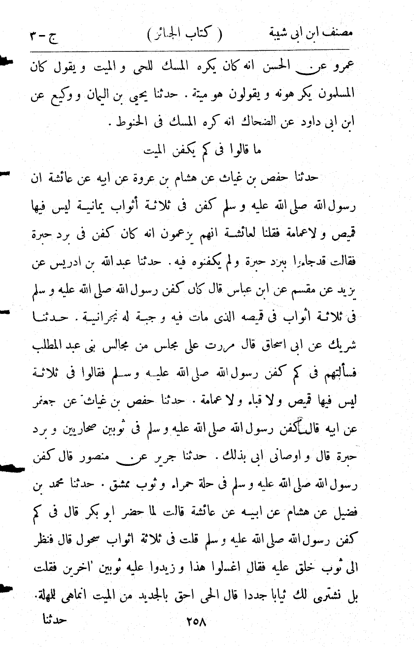 11157- حَدَّثَنَا شَرِيكٌ ، عَنْ أَبِي إِسْحَاقَ ، قَالَ مَرَرْت عَلَى مَجْلِسٍ مِنْ مَجَالِسِ بَنِي عَبْدِ الْمُطَّلِبِ فَسَأَلْتُهُمْ فِي كَمْ كُفِّنَ رَسُولُ اللهِ صلى الله عليه وسلم فَقَالُوا : فِي ثَلاَثَةٍ أَثْوَابٍ ، لَيْسَ فِيهَا قَمِيصٌ ، وَلاَ قَبَاءٌ ، وَلاَ عِمَامَةٌ.